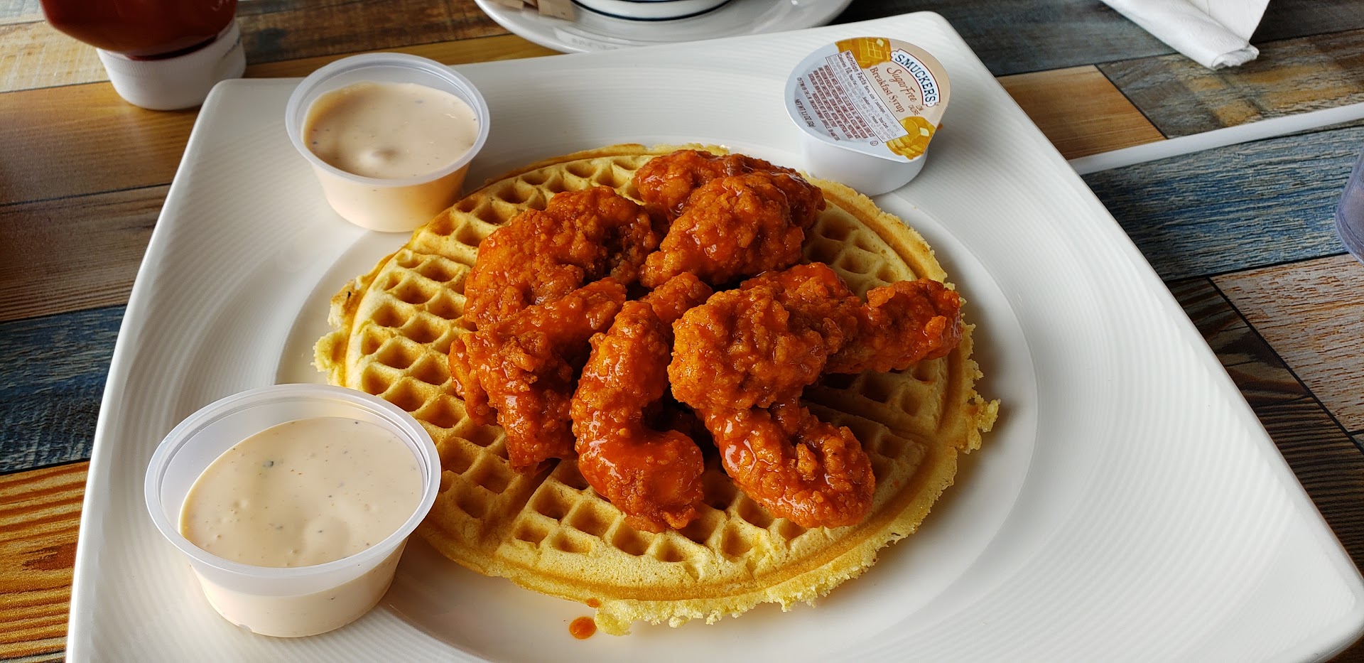 Food: I got the hot chicken and waffle with a side of ranch. This is NOT Nashville Hot Chicken. This is Buffalo chicken in a generic Buffalo sauce. The waffle is slightly larger than an Ego waffle. It was served with a packet of sugar free syrup which I didn't even pay attention to until I discovered I literally couldn't taste it.