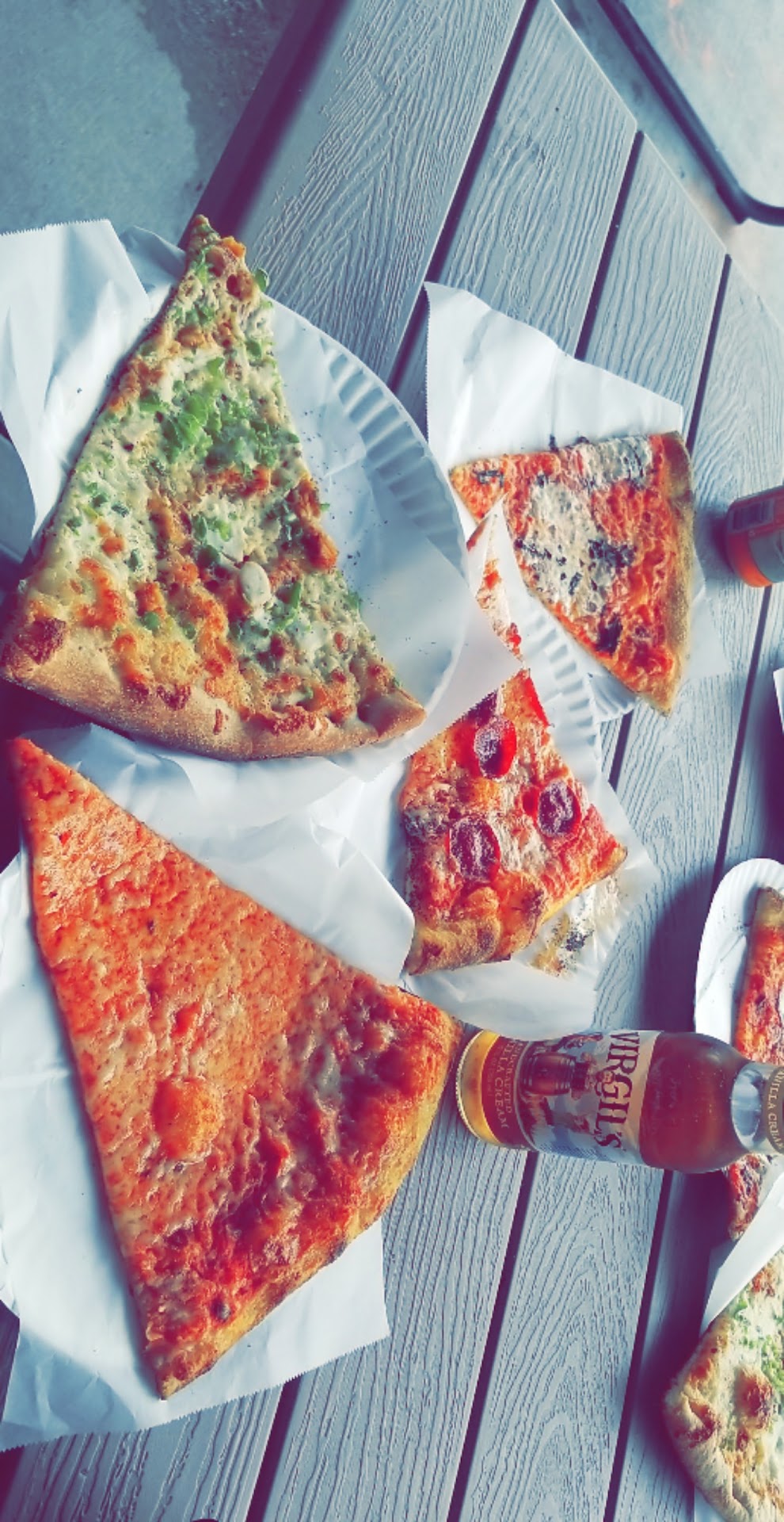 My coworker and I ordered some slices and sat outside. I got a Nashville hot chicken slice, a margarita slice, a cheese, and a pepperoni slice. And you can't forget a bottle of Virgil's cream soda pop.