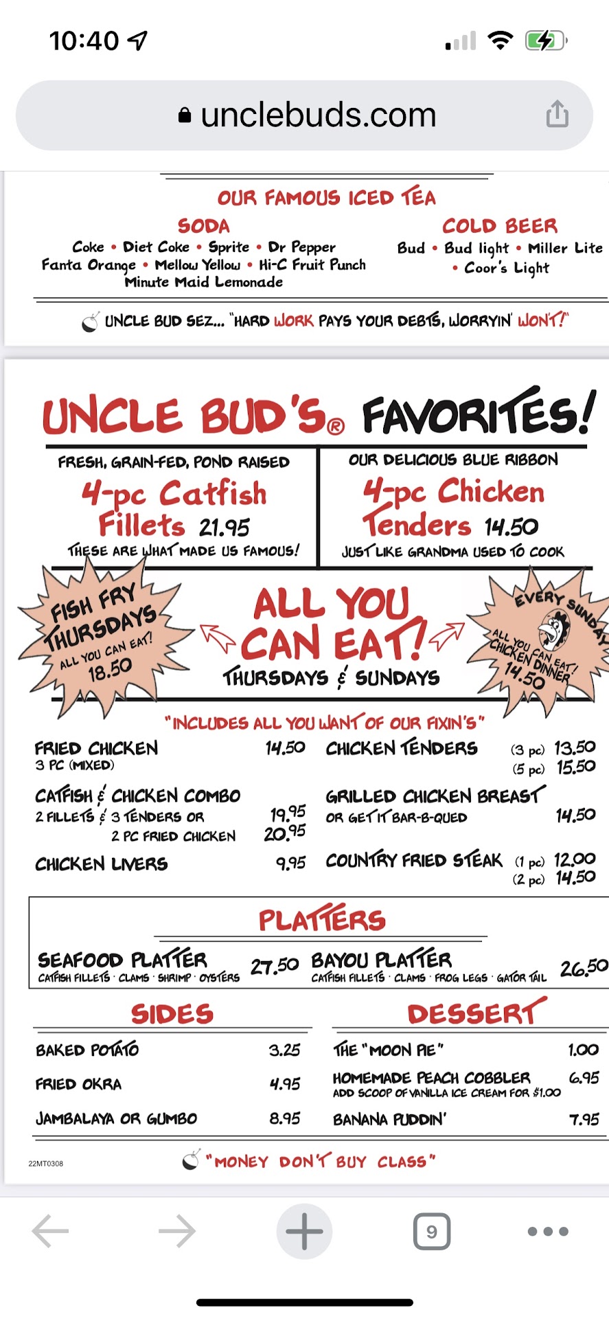 Read moreWhhhooooWeeee!! I love Uncle Bud so much I hope he’ll adopt me 😊 This was my second time here and each time gets better. My first visit was about a month ago and we had the catfish platters with all the Fixings. Hands down it’s the best I have ever had in all on Nashville. ( unless I cooked it ) Tonight I had, all you can eat Fried Chicken!! Thursday is all you can eat Catfish. I can’t even finish what order so I haven’t had a chance to order extra pieces of fish or chicken. With all entrees all the fixings you can eat come with it. Bowls of Cole slaw, white beans, Hush Puppies, Sweet white onions, pickles spears and 🤔hummm did I forget anything??? All the staff make You feel like you went to your Aunt and Uncle’s for dinner. Severs there are top notch! Sabrina was our ser this evening and she is awesome! I would highly recommend this restaurant. You will NOT be disappointed. You may have to be on the waiting list but you can always check out the waiting time and sign you name in on Yelp. 🤫let’s keep it our secret. Bon appétit!