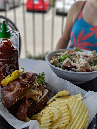 The food, on the other hand, was great. I got their special pretzel sandwich, a Sriracha mayo BLT with chicken (so really a Sriracha Club), and my wife got the strawberry and goat cheese salad with herb chicken. The sandwich was amazing and the best part was the pretzel bun: crispy on the outside, perfectly salty, and soft and chewy on the inside. The rest of the flavors melded well together too, but nothing beats that bun (I have a love/love relationship with bread, so results may vary). It came with a side of chips which tasted exactly like ruffles (Lay's are better, fyi). The wifey's salad was tasty: chicken was well seasoned, strawberries fresh and juicy, and candied walnuts provided a...