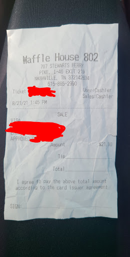 Read moreWe went after the fireworks on July 3rd at Nashville Shores. We asked if they were able to accommodate a large party they said yes. There were a family of 5 that was seated at the counter and the rest of us set at the tables by the windows. My wife ordered a cup of coffee that was black and cold she asked the young lady if she could brew another pot of coffee which she did but after 30 minutes or so of my wife asking for the cup of coffee she finally got it. Two of the kids ordered pops and they were nothing but carbonated water asked for another never got it. We placed our orders 7 of us got the All American Slam, 3 of the kids never got their bacon, grits, and waffles. As a matter of fact only 2 people got waffles because it was the only thing they order. I never fussed nor complain because Michael did his best along with the young lady who was training him. I asked for a military discount and the older lady said she didn't know how to do it. Me and my wife frequent Waffle House alot but in the 13 years we've been in Nashville this particular Waffle House was our first and probably last visit. We tried reaching out to get help on some sort of reimbursement but to no avail. Below was just my party bill not to add the other 6 that was paid separately 5 of the 6 sat at...