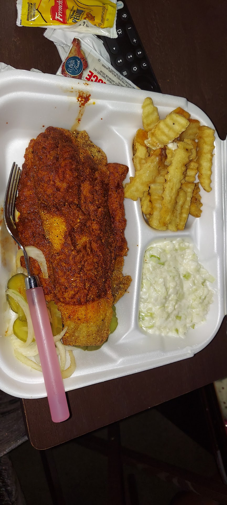 Read moreI've submitted 2 reviews in as many years... I try to refrain from commenting unless it's something exceptional. The fish might be different, but the hot chicken isn't anything special. Good enough, but any of the others in the area (400 Degrees, Princes, Helen's, Slow Burn) are better. Also took 45 minutes to get my order. I know hot chicken takes time to make fresh, which I appreciate, and I've waited longer before... but it wasn't that busy, and even other staff commented that they couldn't believe I was still waiting. The guy making it brought it out, and apologized for my wait... but when I got home my fries were only half cooked. Not soggy or just underdone... still solid in the middle. There is no excuse for that. Dunno if he fell asleep at the fryer or what, but I won't be back and felt the need to...