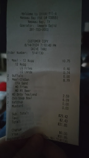 I just had the WORST experience ever at the NASA Pkwy Chick-fil-a location. Everything started off great at first. No wait in the drive thru and was able to pull up to the order speaker. Guy was marginally friendly. Okay, no big deal. I ordered a Spicy Chicken Meal with a Large Sweet Tea and some Grilled Nuggets. He tells me my total and I reply with a Thank You and nothing. Huh? In the history of ever, no one has ever not said "My Pleasure" back when I said Thank You. I know this is trivial, but it's the small things that add up to make a big deal. Just wait and see. Then I pull up and notice that there are five cars in front of me. Again, no big deal. However, 6-8 minutes later, that first car at the window still hasn't moved. I waited about 8-10 minutes in line altogether. While sitting in line, I realized that I hope he didn't charge me for a Large Fry. He did not ask when I was ordering. They ALWAYS ask if I want the Fry Medium because I order a Large drink AND they did not ask me what condiments I would like. After I finally get to the window, the girl there hands me my Tea and I pay. I wait for a moment and she hands me back my card and the bag of food, trying to send me on my way. She did not ask if I needed condiments. I politely told her what I needed. She was also marginally friendly. I tell her Thank You and she tells me Have a Good Night, with little enthusiasm. I drive off completely and utterly....disappointed. I was a little dumbfounded. I honestly felt like I went through a McDonald's drive-thru. What a letdown, and I have been eating at this restaurant for years. First very negative experience and it gets worse. I pull up to my house and walk inside and taste the Sweet Tea. It is RANCID, OLD TEA. Are you kidding me?! I sometimes get sweet tea that isn't sweet enough or it's a little watered down, that is forgivable. This was NOT. It tasted as if it was sitting there for HOURS. Not fresh AT ALL. By this time, I am FURIOUS. What could happen next? I start taking everything out of the bag. I look at the receipt and noticed they overcharged me by ringing me up for a Deluxe Sandwich and a Large Fry. I did NOT order that. Next, I open the box and look at the sandwich inside. The Chicken is visibly old, very old. You can tell it's been sitting out for a long time, not fresh of course, and it was COLD to the touch at that, and hard, and the cheese was not melted and cold as well. Buns were lazily buttered and are cold as well. Fries are old, hard, and cold as well, no surprise there. What an EPIC disaster. I was so DEEPLY disappointed, I threw the entire meal in the garbage, because that's what it was. I expect nothing less than a full REFUND and a FREE MEAL for this subpar customer service experience and dismal food quality. I will not be visiting this location in the near future. However, I would like to give big props and kudos to the El Dorado location in Webster, TX. Only great...