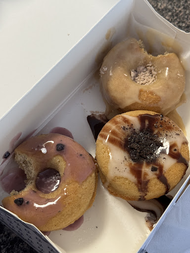 My boyfriend and I were very disappointed in our experience here. We were excited they offered vegan doughnuts, and walking in all their displayed and pictured items looked delicious. When we asked questions about the vegan doughnuts we got very vague and confusing answers from the employees. Once we decided on a few doughnuts, the employee who took our order stated that the vegan doughnuts are “made fresh to order”. We figured we’d have to wait awhile then, but for delicious looking hot freshly baked doughnuts… sounded well worth it! Not even 5 minutes later she walked out with a small box. Excitedly we sat out on the patio to dig in. Opening the box we discovered these sad looking things, that pale in comparison to all their pictured and displayed doughnuts. When we took a bite our doughnuts were very cold, like they were pulled straight from the fridge. Even the glazes were ice cold, but yet they were extremely runny. We decided to go home and heat them up to see if they tasted better that way. (They didn’t btw.) When trying to exit the patio the door wouldn’t open. I had to get another customer’s attention to open the door. I mentioned to an employee that their patio door was still locked, she replied “oh no, it’s broken actually you have to use the other door” and pointed to the opposite end of the building. A simple sign on the door that directed you to the other end would’ve been nice…