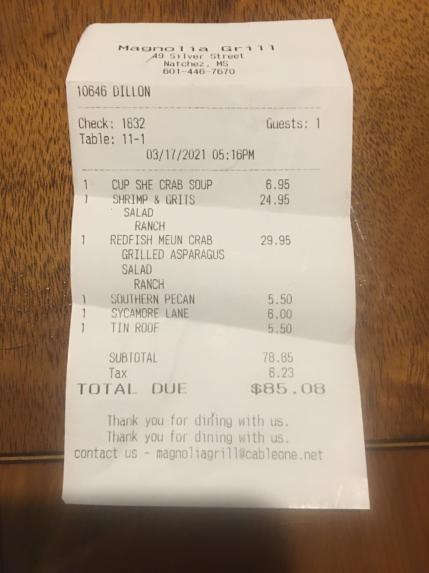 We can recommend the she crab soup appetizer, and entrees: shrimp and grits, and the redfish menu crab. These are large and satisfying portions. $85.08 plus $16 tip.
