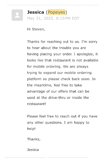 Read moreNo more app orders here as of May 25th 2025. Sent email to corporate and answer received was “yeah, you’re right, they’re not accepting mobile orders” 🙄. The. She goes on to allude to using app here via drive thru or inside the restaurant which made zero sense because this location IS NOT available in any way shape or form on….the…app. So whatever will be going across the river to Vidalia which isn’t that much more out of the way and honestly the staff there actually get your order right and can handle an influx of orders instead of it taking 30 minutes to deal with 5 customers ahead of you. Better yet prob easier to just cook at home because ain’t no way in hell you’ll ever see me pay regular price for anything there. Can feed 4 people via cooking at home for what they charge...