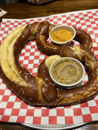 Read moreAtmosphere and staff were great. Very clean. We enjoyed the Greek salad, German pretzel, two different pizzas and the seasonal flying waffle a la mode. â˘German pretzel was great. Served with brown mustard and beer cheese. â˘Greek salad was good but it was served in a metal bowl with a metal fork. IYKYK. Also was missing the red onions it was suppose to have(in the description). â˘Had the bbq chicken and a build your own ham and pineapple. â˘Bbq pizza comes with sliced chicken and was sparse. Also has cilantro and I just feel as though it doesnât belong with the flavor profiles. â˘Ham/pineapple pizza w/jalapeĂąos-ham inconsistently cut and was double/triple stacked in some spots. Jalepenos are pickled/not fresh. Slices were semi limp on both.(some people are peculiar) I like to see the sauce and topping go further toward the crust. Felt like a lot of waste here.