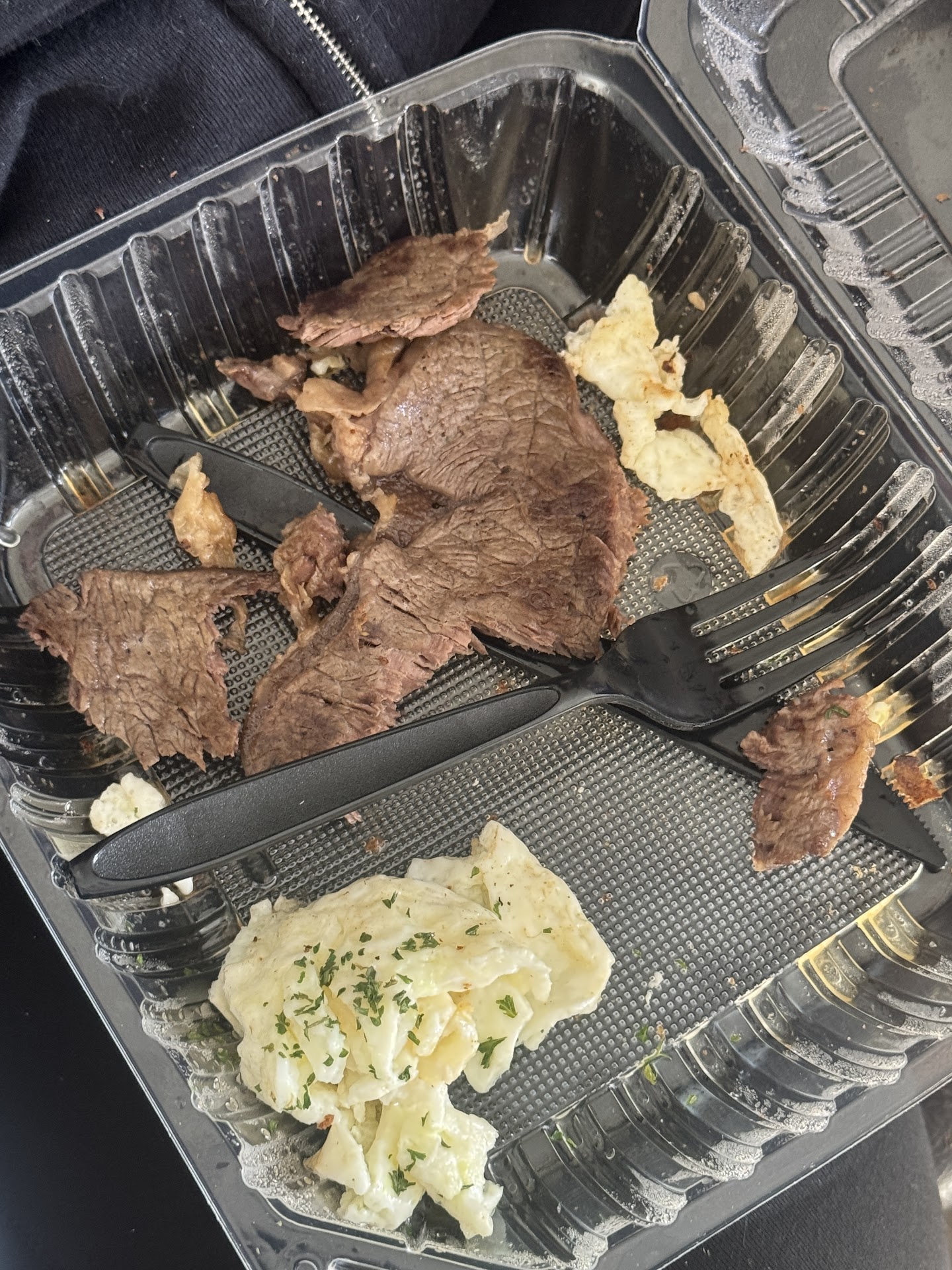 Ā Ā Ā Read moreI opted for their much-touted "steak and eggs," which boasted an 8oz ribeye. What I got served was basically a slap on the face. The portion resembled more of a diesmillo cut than a ribeye, and the flavor was sadly lacking. The meat was bland and marred by an excess of fat, making each bite a chore rather than a pleasure. To top it all off, the egg whites came with an unwelcome surprise(hair) that completely ruined the experience.(picture of hair is after I pulled it out of my mouth and placed it on top of the food for picture). As for the sweet potato fries, they were far from fresh, adding to the overall letdown. Given the quality of food and the price point, I couldn't help but feel that a meal at Texas Roadhouse would have been a far superior choice. There is no way i was going to eat it, so I gave it to my dog. It was a complete waste of money, and time. Iām still hungry, and will now have to cook something myself. I do not , I repeat, DO NOT...