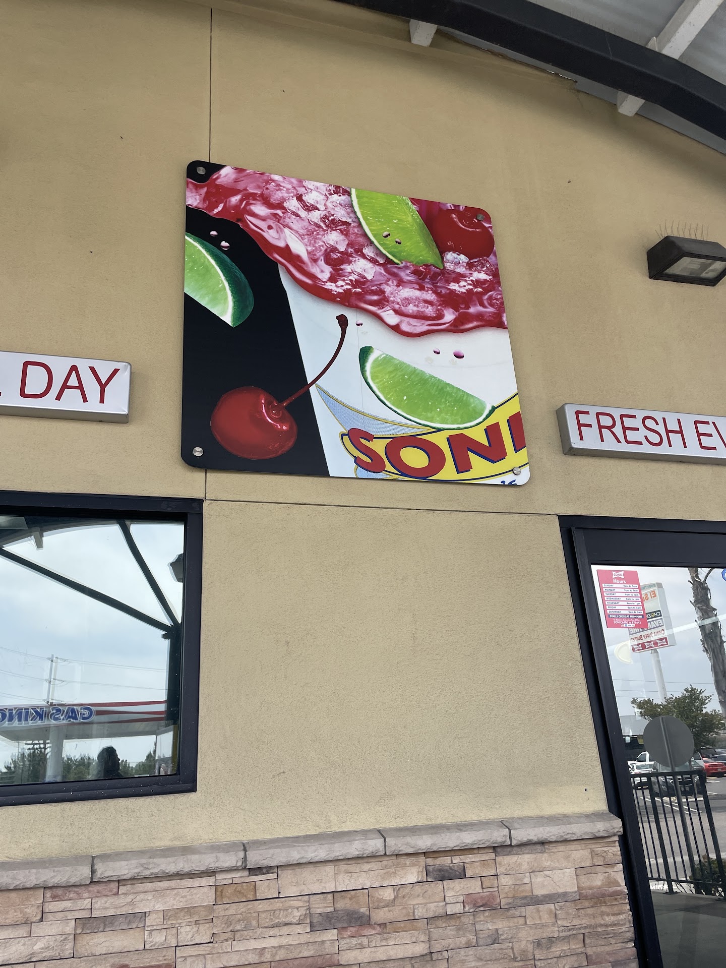 Read moreI have not been to Sonic in a long time. My wife and I were next door getting some new tires and decided to get some beverages. The shake was just okay my wife and I have had much better. I ordered chicken fingers with tater tots and found them to be good but not very good. The tots we're small and the flavor was so so. The sauce provided which is a Sonic Drive-In sauce individually packaged was not good at all. The consistency and flavor was definitely poor. All in all for a quick stop and bite to eat we found what we ordered to be just okay. The novelty of someone roller skating to your car is not a big deal to me. We walked up and realize that there was nowhere to sit inside, that you had to order from a walk up order station and then someone brings your food out to an out-door table. We had no problem was sitting outside but it was hot and inside air conditioning would have been nice. While I get that they expect that you'll sit in your car in your own air conditioning you would have to have your car running for that. And if it's cold outside same problem you have to have your car running to keep it warm or you'd have no place inside. Worth giving a try sometime in the future but not excited about the food overall when there's so many other great places...