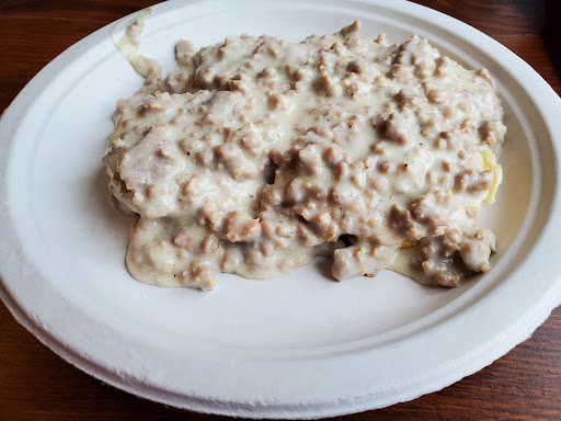 Man the food was delicious I had the biscuits and gravy the biscuits where great not to salty and a little flacky . They where soft and a little firm and buttery but definitely not tough. Then the gravy ooh man it was good nice flavor a hugh amount of meat and good color they didn't cook the rue too long , good seasoned meat and savory sauce to complement it.