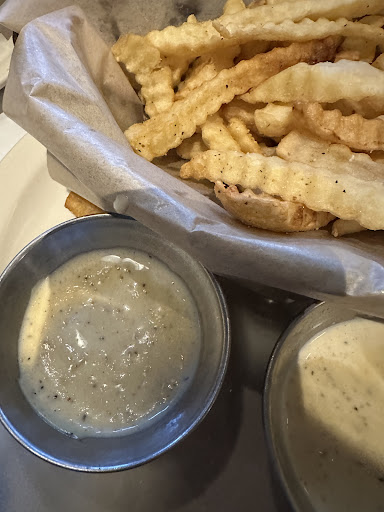 The food had obviously been oddly plated judging by the ‘skin’ that had formed on the sauces and room temperature beans and mashed potatoes. I can also say with confidence, that their fryer was not up to temp owing to the ‘ultra-soft-fried’ chicken fried chicken and the Ore Ida french fries that are totally different than what is supposed to be served (see photo)—their fries used to be a family favorite. When we asked if there had been a permanent product change, first we were told they were the same, and when the server realized we knew that they were, in fact different, owned up to having run out of their normal product. They were kind enough to remove the undercooked substitutions from our bill. The kids’ med-well burger was hard and grey, and was plated with the same flaccid, unseasoned fries.