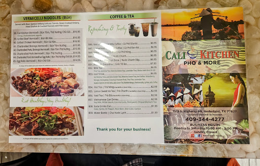 Read moreThis place is fantastic! We live in Nederland but will usually drive into Beaumont for good pho. We recently discovered Cali Kitchen and I am blown away by how delicious this broth is! I have always been a fan of using red onion + white onion, and they do. They also have a great selection of milk tea here, which is delicious on it's own as a treat. My favorite part about this place is its spring rolls. Every pho place I go, I try the spring rolls and have never had any better than these. The ingredients they use are perfectly proportioned and very fresh. They do not overdo or underdo them. I'm so happy that we found Cali Kitchen and will definitely be eating here as a...
