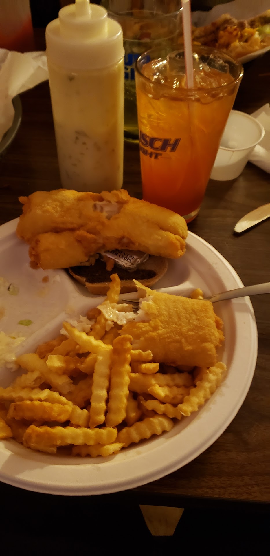 I got there between Friday noon rush & dinner rush,at about1:30pm This bar/Grill is one of the great up north family owned small tavern,every body knows everyone, bar rail a few tables ,a couple of chance video machines ,the grill and fryer is right behind the bar, nothing to hide.small menu, I hope they are on the Wisconsin fish fry list of places to try.. Bergers,also a dish they call the monster - 1/2 lb + 1/4 lb beef pattys + a brat .....would like to try it next time oh my......some pizza and a great fish fry Friday small=1 piece - medium =2 pieces large= 3 pieces and alternate shrimp, scallops,and and a mix 3 item plate , Thursday is ribs.....want to try that next time oh my... I had ; onion rings.....mmmmm good, and the medium cod dinner came with Cole slaw , great potato boiled egg salad,oh my loved it, and a slice of marble swirl rye bread + butter.... I don't drink alcohol so I had lemonaid but they were one glass not bottomless,so I had mountain dew witch was bottomless.... The bill was $37.66 for myself. No handycap parking or special door automatic opening, but hey it's a small saloone, the hospitality and food makes up for it... some parents may or may not bring small children unless they are hungry ....but up north family invirment..... Was never waiting for service, love it. Did not get the name of the cook/ bartender, or his mother owners,but love the down home feeling..... Might just make this my go to tavern... 5/5 or 9/10 * for the not having handycap , but I'm not holding it against them.... So much good food to try..... I'm definitely coming...