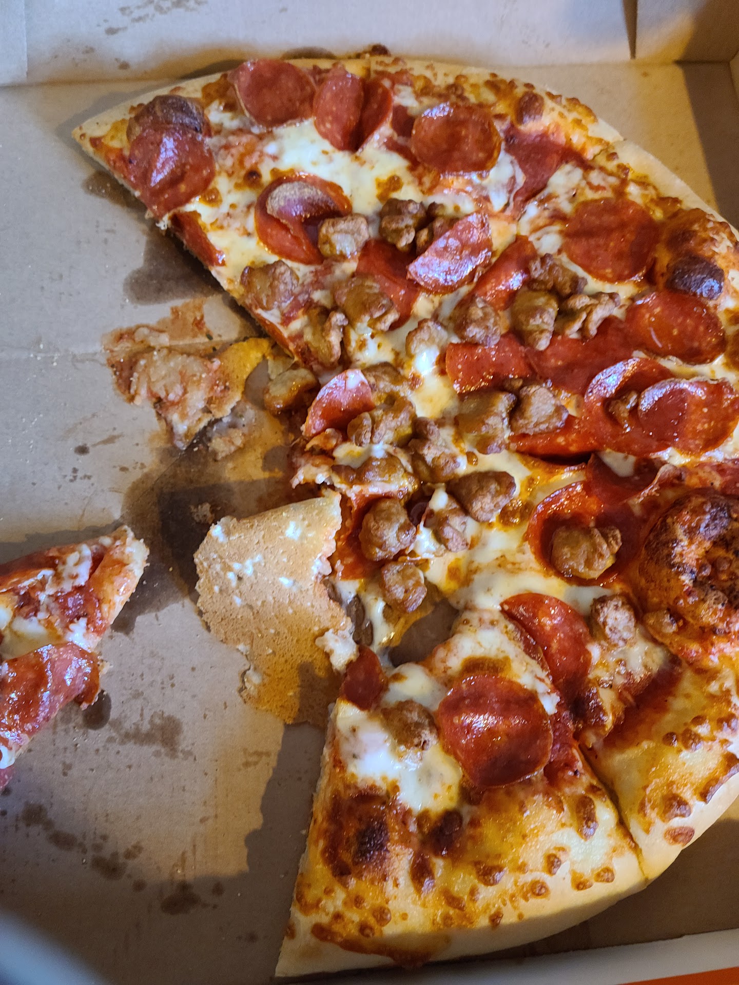 I got my pizza out of the portal and waited at the counter for somebody to come up and help me. The kid looked at me, grabbed a crazy sauce and literally threw it on the counter so it slid into my pizza box from about 3 feet away and just stared at me.