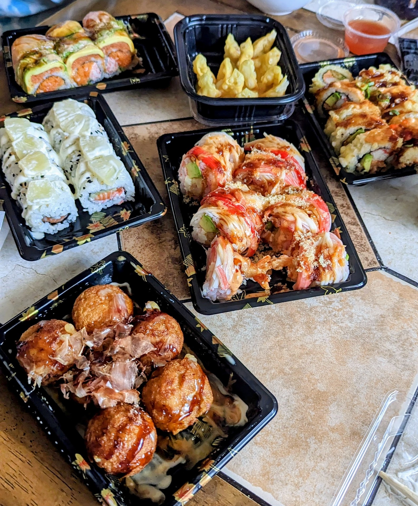 Cons: No dishes - everything served in tiny little takeout trays even when dining in. No fresh wasabi or ginger, given takeout packets of these for dine in meal which was not tasty and was a bit off putting. Sweet and sour sauce for egg rolls not good at all. No cups of water available, have to purchase bottles if you want a water with your meal. Priced similarly to Osaka / Nakashima’s ($60 for two people eating two rolls and eggrolls). Interior not in very good shape, was dirty (floor, bathrooms, cobwebs, etc). Transformation from previous Pagonis restaurant looks like it was rushed, new coat of paint on walls and ceiling looks really bad and rushed.