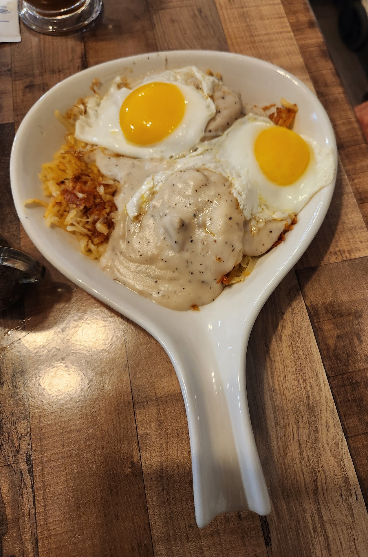 Friend ordered the same thing with scrambled eggs. Said his hash browns were also undercooked and even watery. He mentioned that there was a lot of pepper in the gravy and also that it had zero sausage in it. His scrambled eggs were overcooked to the point of being rubbery.