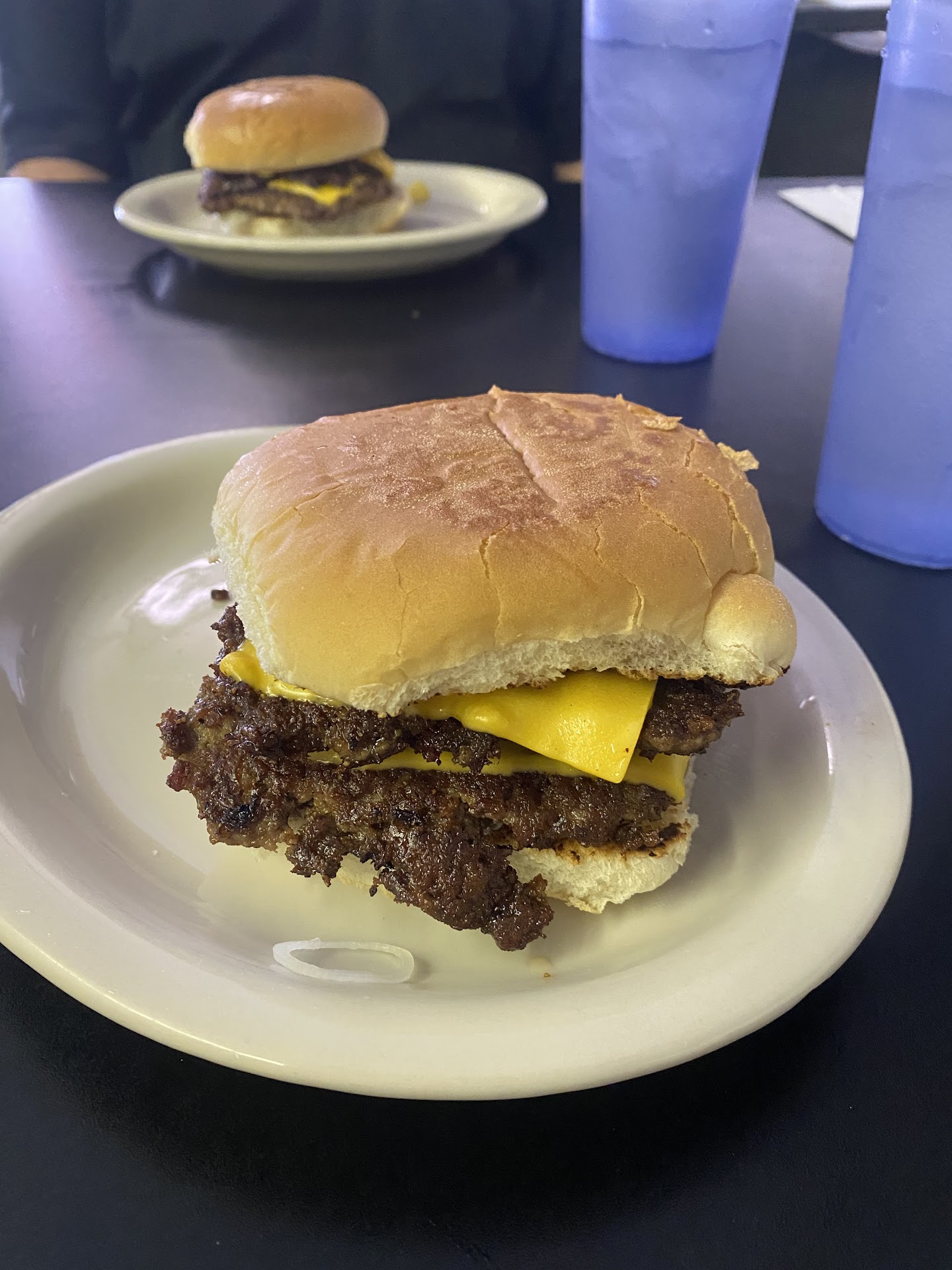 I came here with high hopes because of all of the good reviews. I love a good greasy burger as much as the next person. I wasn't expecting anything gourmet... but this was sub par. The waitress was excellent... for a while. She was attentive and sweet until I got my food... then she ignored me till I was halfway through my burger, then brings me the check and walks away without saying anything. As for the food... the patty's are indeed thin and delicious! The bun is well... a bun. I was asked if I would like to have grilled onions, I love grilled onions, so I said yes. What I received on my burger were three thinly sliced rings... not even a whole slice of onion. Inside the burger, they were undetectable. The fries are not fresh cut like they say, and are not cooked per order. These were greasy and crumbly like someone just fried a whole bag of Suzy Q's left them sitting for an hour and then put all the little bitty ends and bits onto my plate. They were lukewarm and so crunchy that they were inedible. I will never set foot in this...