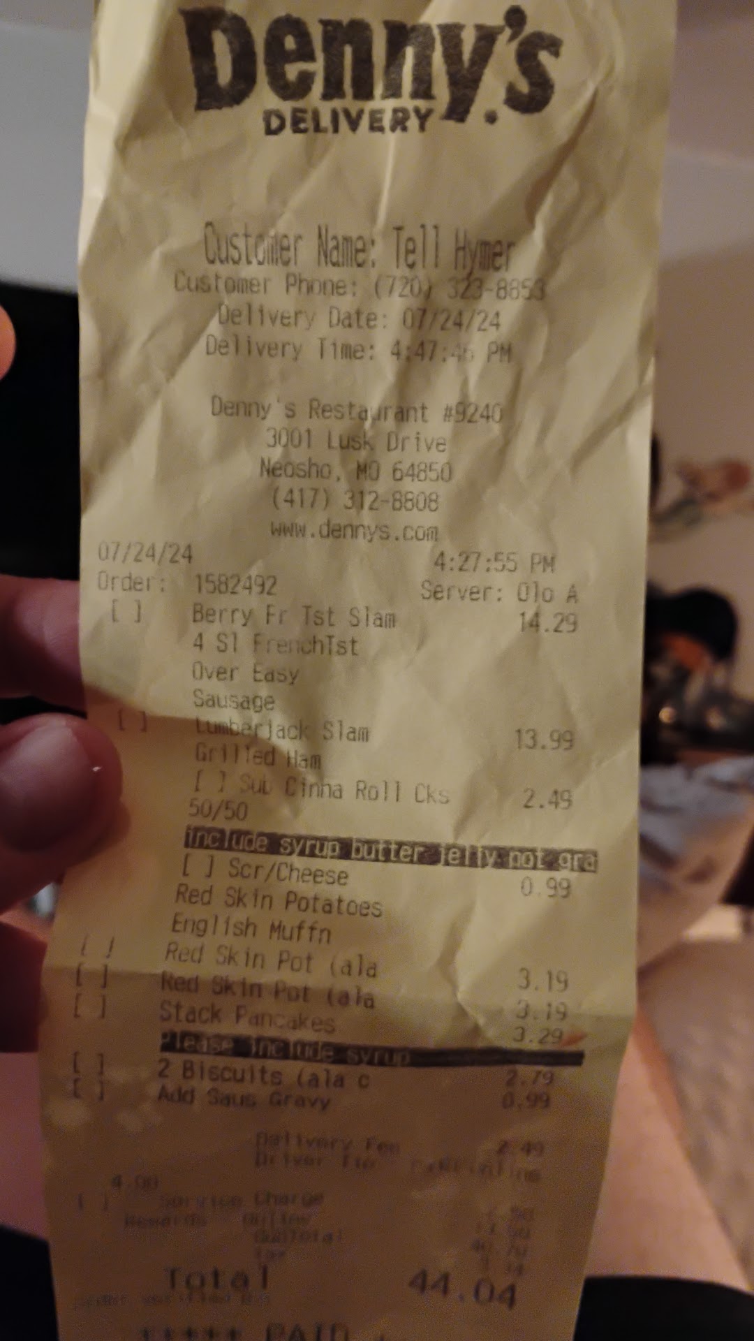 Read moreOk, so, I went to Dennys in neosho and I was horribly disgusted. When I got there The waitresses were nice and it was busy understandably, it is Saturday, however, they donât allow food or drink of ANY kind from outside, i has a water bottle cause Iâve been dehydrated and they got onto me about it. Ok, well, I put it away. Next The menu is new so I looked around to see the âNewâ prices, for 2 to eat, your looking at 30-40 bucks! It was $27.98 and that was with a 20% discount!! So anyway, when I ordered my food The waiters kept asking me biscuits and gravy or bread?, to which I responded B&G, then she asked jalapeño?, to which I said, sure, then she asked, âsalsa and sour cream?â I said âsalsaâ. Youâd think, cause I thought, that all that would come with a dang Philly Omelette⊠nope each one of those things was .99 or .89 cents!!! If your going to all someone about all that make sure they are aware that it costs $6 extra!! Anyway other than being lied to about the sides in such a nice way, The waitress brought out my water no ice with lemons in it, i did not ask for those. The B&G tasted so bad I almost threw up after taking one bite, they used to be my favorite đđ. The salsa came in a tiny side cup, for an extra dollar!! Which I didnât even know I was paying for??? Till I got the bill! My friend ordered pancakes with fruit on them and the fruit was rotten!! The pancakes were 50% smaller and the price was 1/3 more expensive!! I understand inflation, but that experience was WAY beyond just inflation, that was downright horrible, i wonât be coming back. I hope yâallâs experience is better than mine was. Oh to top off this review, i went to the menâs restroom and the entire floor was covered in sticky pee and I did my business and grabbed some paper...