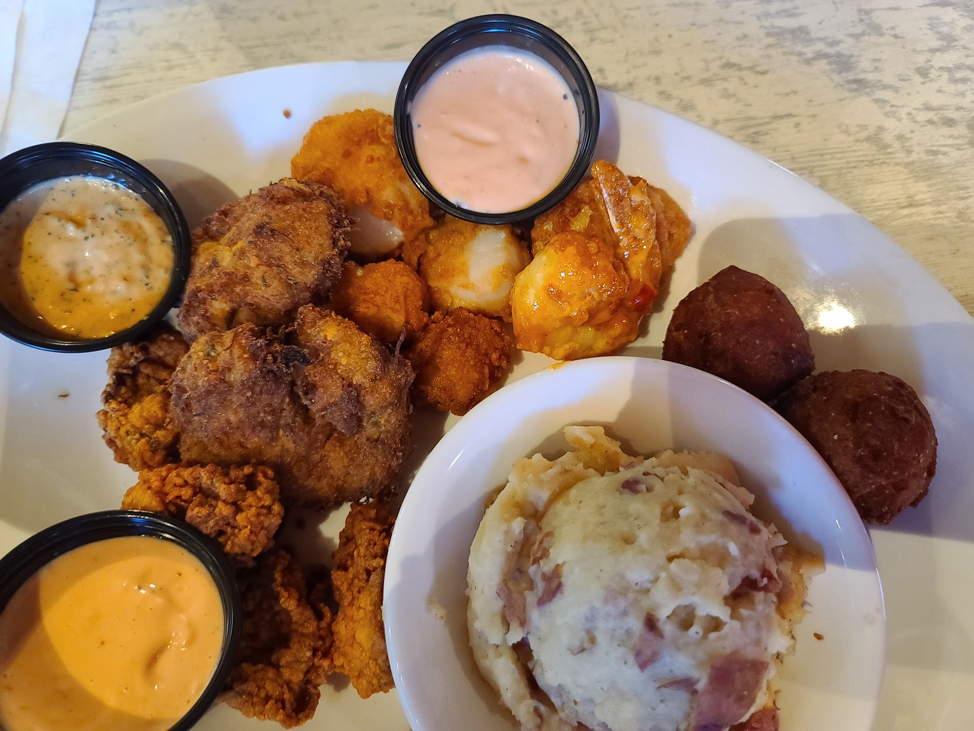 I ordered the fried oyster platter and a and cucumber and tomato salad. As for the oysters..I didn't ask about the dredge (and I should have) and if they could fry my oysters hard...if you know, you know. My guess is they used some kind of of a wet batter.....uhhhhh....no. What little crisp there was, was no more 10 minutes into my meal. The oysters lacked true flavor. Please consider a different dredge method. A dry seasoned flour and corn meal dredge will allow the oysters to remain crispy. One last thing....Tabasco is not everyone's choice for that dash of "fire" Just a suggestion.