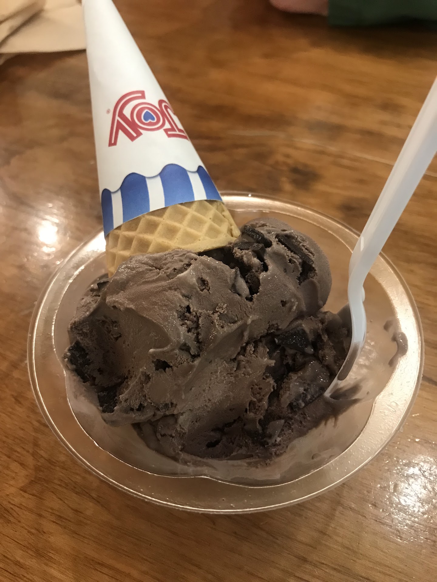 We ordered the Truffle fries as an appetizer. They were decent enough: far from the most decadent, but definitely more than just the regular fries. The mains were a regular hamburger, cooked well-done and a B & B burger (bourbon sauce and Bleu cheese), cooked medium. Both came with and accurately described "handful of fries." The regular burger was chewy and had fat globs that made it a disappointing pattie. The B & B was cooked nicely, but disappointingly used Bleu cheese dressing rather than chunks of Bleu cheese. The bourbon sauce was sweet and complimented the burger, and they cooked the bacon to a crispy compliment, but the sauce mixed with the dressing was a runny, drippy mess. The seasoned fries were on par with the experience.