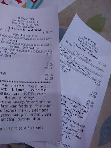 Order for takeout. This is a combo location with KFC. There are accessible parking places near the door, the entrance is accessible, and seating is, as well. Pleasant, efficient service right away, as soon as we were ready to order. The very nice girl who took our order was easily able to tell us what all was on the different items and compare between choices. We each got one KFC and one Taco Bell item for dinner. Restaurant was not crowded, and the drive-through appeared to be efficient as well. Our order was right the first time - which is highly unusual for this location; we usually get shorted at least one item, and often have individual orders wrong at pickup (we get food from here at least once every 2 weeks). Crispy strips were yummy, as always, but I wish KFC would bring back its old Sweet & Sour dipping sauce; the current sauces are less-than-yummy. Original 3-piece white meal had one good chicken breast, one tiny, greasy chicken breast, and one really greasy wing. The Mexican pizza was very good, and the Supreme Burritos were excellent, also. Our order was complete quickly and efficiently, and service...