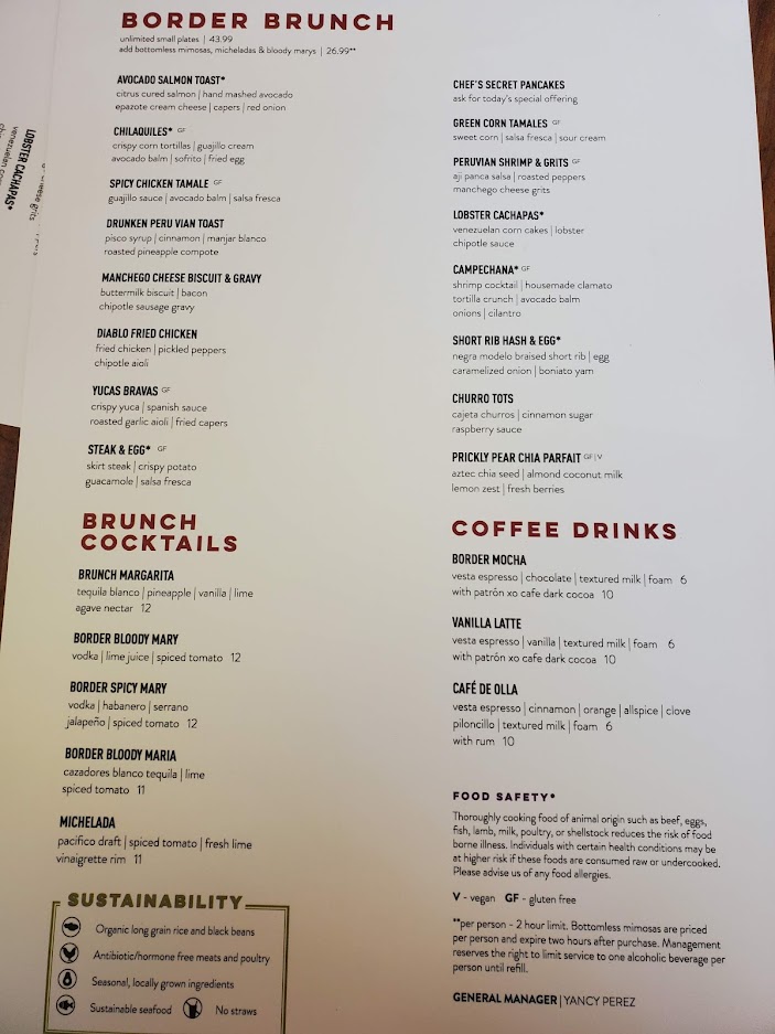 Review for Bottomless Brunch. We came here for brunch on our last day in Vegas. We decided to hang out in the Mandalay Bay because it's closest to the airport and there's fun stuff to do there. This brunch is a great option if you're flying out on a weekend and want to kill time at a nearby casino! Also Mandalay bell desk stored our luggage. Overall the brunch is good. It sure is bottomless and I felt like I needed to be transported in a gurney outta there after eating. Fun to try different dishes. I eat pescetarian when there's not vegan options and was able to eat 11/16 options on the brunch menu. So it's still worth it for pescetarians. At home, I mostly eat vegan but sorry vegans this brunch is not for you. There is a grand total of 1 vegan option (the prickly pear parfait which is really good but hardly worth it for $43 brunch). For vegetarians, there are 7 options so could be worth it (though much of the options are sweets and personally I prefer a savory breakfast). The regular menu has some really good sounding vegan options though! I'd love to come back to try them next Vegas trip since I now think I'm going to make a tradition of spending the last few hours before the airport at Mandalay :). The drinks are good here too. I got a classic margarita and the guayaba spritz which was delicious with the jalepeno tequila and rhubarb. My favorite brunch choices were the shrimp and grits, the churro bites, and the chilaquiles. Overall everything was enjoyable--some were amazing, some were closer to okay. FYI, some of the food was on the colder side. Not all, but there were a few dishes that I wish were hotter. And there are a few dishes that advertise as coming with a fried egg on the menu, but it came with scrambled. They would have been better with a runny fried egg as advertised. Also we had some friends join us later (1:45ish) and the waitress said the kitchen closed at 3 so encouraged them to order everything they wanted upfront. Go earlier if you don't want to feel rushed. Kinda lame to rush people when there's still over an hour left, but make your reservation for 12 or 1 if you want a leisurely brunch. Overall it was worth it, but not mind blowing and a few stuff that was so/so. Would still eat here again though, but probably try the regular menu. Also don't let this deter you from the brunch, another thing was that it was labor day weekend and BUSY, I would guess and hope that contributed to the cold-ish food and lack of fried eggs and rushing. It's a nice restaurant on the inside, very big and we sat downstairs...