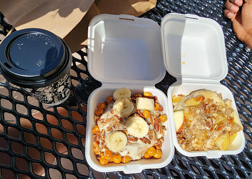 I ordered a cinnamon roll with banana cream, bananas and pretzels, and a coffee with cream and sugar. My companion ordered the Caramel Apple Pie cinnamon roll.