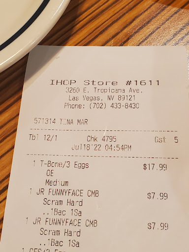 Read moreWhen I first came in there were literally 5 or 6 people behind the cramped hostess counter. They were all talking and laughing while about 3 different families were waiting to be seated. I was solo and they looked at me like I was interrupting them. Once seated I had a waitress that was obviously rushing me. The food was nice and fresh, though they gave me over easy eggs when I asked for over medium, no big deal though. What got me was the fact that all the waiters/waitresses were wearing whatever they wanted it seemed. They were either in black white or red, some had IHOP logos, some didnt. The restaurant was packed, which doesnt bother me, but it's a location that always has a lot of people. So why not have a uniformed staff? I didnt know who I could ask for help and who was just a customer/busser. When I was ready to pay I walked to the hostess counter because they have a cash register and my receipt had a whole bar code they could scan.