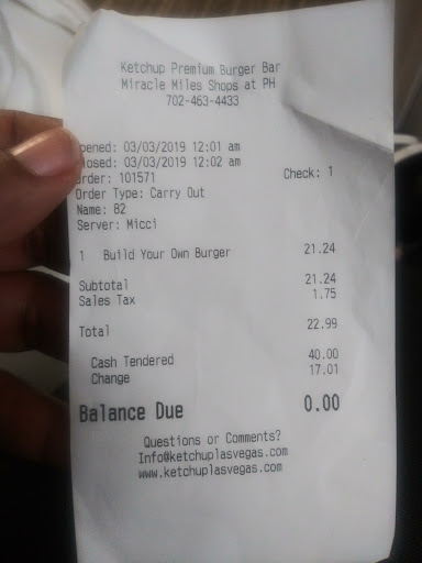 Ā Ā Ā Read moreKetchup was a pleasant surprise. It's open late (until 2 AM), even when the rest of the shops and restaurants are closed. If you're looking for a substantial meal after hours, this place is excellent. They have a simple menu that doesn't overcomplicate burgers, and something like 5 varieties of flavored ketchup (BBQ, sriracha, jalapeno, garlic, etc.) which is where they get the name, I guess. They have milkshakes, including "spiked milkshakes" with liquor. There is probably about 5 varieties of burger, 5 spiked milkshakes, and 5 sides (onion rings, tots, fries, rtc.). Again, not over complicated. We went twice and on the first trip I got the classic burger. It was a substantial patty, much bigger than the typical burger joint. They even cooked it medium-rare at my request. I had the fries and a soda since the shake machine was off/broken. The next night, I went back and got the burger of the month, the California burger, which is pretty much an attempt to recreate In N Out burgers. It did not disappoint. I also got the spiked Strawberry Shortcake shake, with strawberry, cake vodka, and whipped cream. Just the right amount of vodka and tasty to boot. The price is pretty affordable, especially when compared with the sky-high prices up and down the strip. Filling, delicious, fair price. I definitely recommend Ketchup. Oh, and by the way, they have a burger challenge where you can try to eat a big burger in under 20 minutes. So, if you're into food...