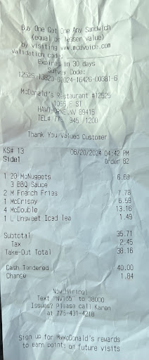 Read moreAs always, with so many employees coming in and out, quite a few times something is missing out of my order, or your order is messed up. Also, I believe it's absolutely bizarre, that still during the end of a pandemic, they NOW charge you $.50 cents for everything that you would want to add extra. Look, I absolutely get it when they charge 50 cents for extra cheese but 50 cents for dehydrated tiny few onions or an extra chip or two of a pickle, that is absolutely crazy. Also, if you get a fillet of fish, they put HALF of the American cheese, and if you ask them to simply put a full square of cheese, they charge you 50 cents for half of the cheese that they already shorted you in a first place? Unbelievable. McDonalds is becoming more pricier than In-n-out!!! And In-n-out much better and healthier, as they use real cut potatoes and better oil and meat, and they rarely mess up, and always smiling. How is this possible? 50 cents for a half slice of cheese in filet of fish? 50 cents for tiny extra drizzle of DEHYDRATED onions, or few pieses of extra pickles? Just unbelievable. Sorry for the harsh truth. Unfortunately, it's one of few places here, and...