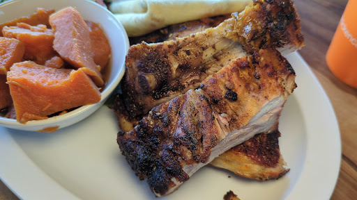 Tried this place out on a Saturday around noon. Ordered the family chicken and ribs meal with chicken pasta, Mac n cheese, garden salad, and 2 extra sides of black beans and mashed potatoes w/gravy. The chicken pasta was creamy, but bland- would not get again. The mac n cheese was ok- my 10 year old didn't like it though & that's one of his favorite foods boxed/homemade/El Pollo Loco/Popeyes, the black beans were ok. The mashed potatoes w/gravy were good. The ribs: the meaty exterior chunk of the pork ribs was super dry, the meat closer to the bone was more moist, but they were not juicy, fall off the bone, or fresh looking like some of the pics posted in prior reviews. The seasoning was good, but more like a rotisserie chicken you'd get from the grocery store, not like a southern BBQ rub and the ribs do not have a smoked flavor even though the restaurant smells like a traditional BBQ joint. The chicken: seemed old and dry...and I went for the thigh. The seasoning was the same as the ribs. IMHO, El Pollo Loco is better and if you want a standard, juicy rotisserie chicken- Smart and Final has a great bird for under $10. The BBQ sauce was weak, it did not have bold flavors like Sweet Baby Rays or Kinder. The sauce for the chicken wasn't that good either; there was a slight taste of cilantro but not sure what else was in it- I mainly used it because the chicken was dry. There were three ppl dining inside the restaurant (on Sahara & Jones) when we went and there were only 2 slabs of ribs cooking, unlike prior pics with several slabs of ribs going all at once. Business seemed slow. No problems with the staff. Food was put together quickly, we were out the door in less than 10 minutes. There is plenty of seating inside, but, unless you want to smell like BBQ the rest of the day, I wouldn't recommend dining inside. I might try this place out for lunch for a wrap during the week. Maybe the chicken will be...