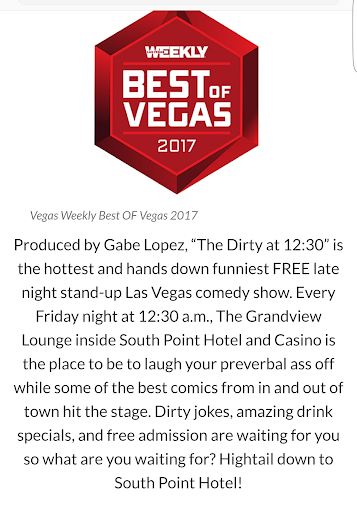 Didn't like it. What happened to when Southpoint had actual bands free in the showroom worth going to... now it's cheesy stuff in this open bar area with a piano and lame comedians to get drunk to laugh if you can find a seat, it's totally stupid. Absolutely no fun anymore Southpoint lost my business in the entertainment area and I stopped staying my wanna get away from home now and then nights there also no entertainment, buffet went to junk, prices went up. Overall experience went to a 0. I stay elsewhere now. Look around there way more to do not far you'll be over joyed doing, M casino one of them pool movie nights and music in lounge, and free pool aces for locals and list goes on. Southpoint needs to fix there entertainment people like the local loung live bands, dance enjoy it's vegas not a ...
