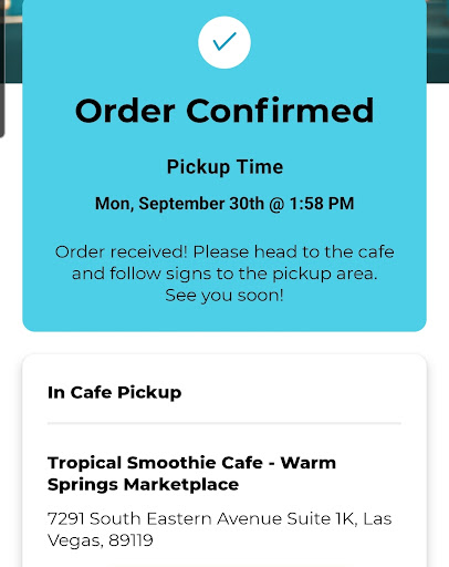 Read moreI really hate complaining about places and reserve comments only for exceptional service or food. Although the staff which there were 3 are friendly a few things made me give them a 1. They all where wearing masks however one of them had it on below the nose line. Which renders it meaningless. Being my 2nd trip ever to this location I won't be returning. I passed off the first trip to a new employee perhaps and moved on. Because they didn't know their own menu. However I ordered online this time as i had to rush my dog back to the vet because she ripped her stitches from surgery yesterday. While I waited for the vet to redo them and rebandage her I decided to order online. I placed my order at 112 pm. It said it would be ready by 127pm. I arrived at 138 pm and they told me it would be another 20 minutes before they could make it. My immediate thought was I ordered 2 standard smoothies from your normal menu and it takes almost an hour to make them? How do you even stay in business that way. It should never take longer then 2 minutes to make a drink. 5 maximum. I'm like I could have gone to 5 different Starbucks ordered there and recieved my order in that amount of time. I'm not sure what all the issues are at this store. But none of it makes sense or really makes me want to waste 20 dollars on essentially a...