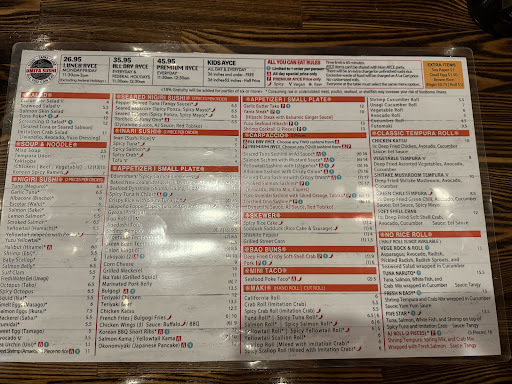 You have 60 minutes from the time you start ordering to use your AYCE benefit. Some photos of menus shown in reviews say 75 minutes, but our menus said 60, so you have less time to stuff yourself! ๐ We were there about an hour, and it did NOT seem like they were using a stopwatch on us! ๐ When they talk about ordering one item at a time, they are really referring to special order higher value items. They have a little blue ball with a number 1 located next to the item on the menu. Premium items, which you can only order if you get the premium AYCE ($10 more), are also identified with a maroon colored โP.โ We were perfectly satisfied with the scores of normal offerings they had, so it was not worth it to us. This part seemed a little confusing and was what the other tables were asking about as well. Yes, you can order 10 items of sushi at one time if you would like! Not โoneโ๐ The items included in the AYCE include pretty much everything on the menu, be it soups, sushi, tempura, or special small plates. The fish was tasty and fresh. Not the best I have ever had, but still very respectable and good quality. And given the prices, fantastic. Fairly thin strips of fish, but long, and about a third of the rice you would normally have with Nigiri sushi, so you are not getting filled up on rice! ๐ With both of us getting drinks, and the AYCE, we got out for under $100. While you can order ร la carte, if you are getting more than five to six two-piece orders, you are definitely better off just going with the AYCE. Definitely keep this place in mind for affordable, good tasting sushi. If it is during prime dinner hours, consider making a reservation, as it got quite busy as we were leaving. We made our reservation via Open Table....