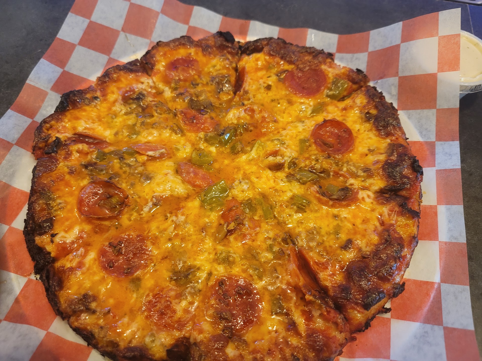 Follow-up trip to the Dipper. Went with a Linguica. Ordered and ate at the bar. Came laced and well done automatically. Previous trip ordered out. Was quoted 25 minutes for the pizza and it took a little longer. No big deal. Went with half chorico and half pepperoni pizza. If i could only pick one, I'd go with the chorico. Good amount of toppings, didn't specify, but it was cooked well done. Very good overall taste. Some grease to be expected from the meat toppings. Sauce is good. Crust had a good crunch along the edges and flavorful. Very little flop. Definently a personal pizza. Thin crust and can be eaten entirely in one sitting. Ran the numbers on my scoring system and the pizza gets a Google 4, 7.1 out of ten...