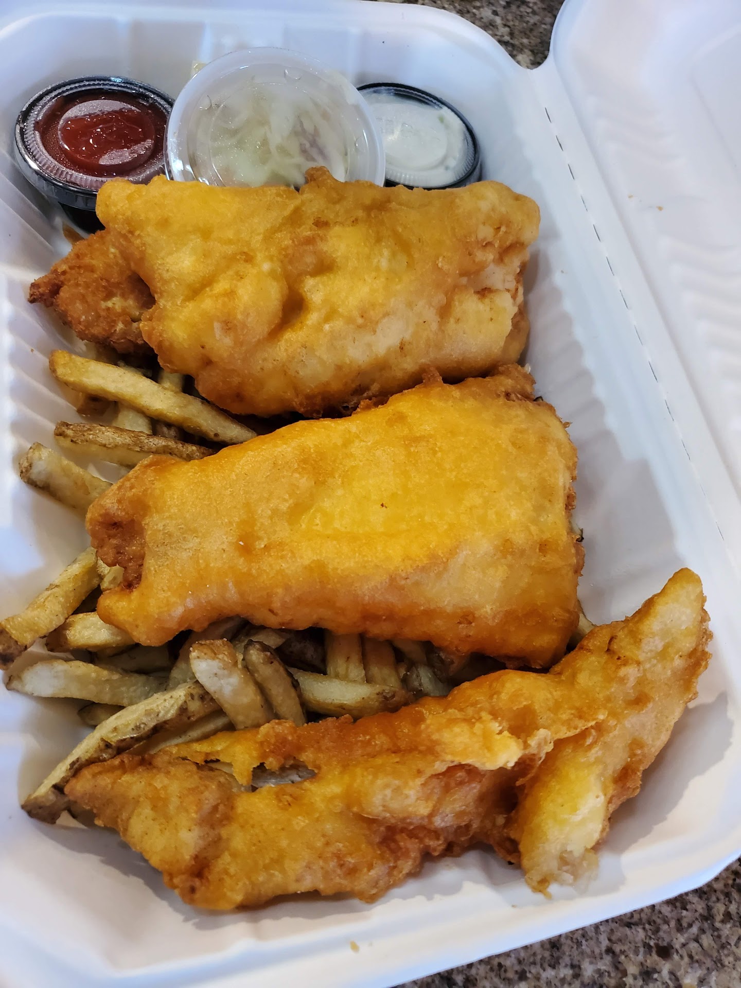 I had a large fish and chips. What I got was 3 huge pieces of white fish (probably haddock or cod) deep fried in what looked like a beer batter, English style. The fries were fried separate from the fish (no fishy or oily taste at all). They were the best fries I've had in years, browned perfectly with a deep hue and served up hot. They had no off flavors of stale oil or being fried and too low a temperature.