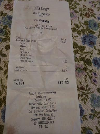 Ā Ā Ā Read moreI walked in ten minutes before closing, after the employee unlocked the door. I ordered a pepperoni pizza. I noticed three bags of crazy bread in the warmer. The employee grabs them and I asked what are you going to do with them. I was told they are getting discarded. I offered her a dollar for one, she said that will be $3.31. Damn full price for an item you are throwing away. Well I notice a grey trash barrel full of pizza. and bread. I took a few pics because this company would rather throw food away than take a discounted price.The employee started screaming how I am illegally taking photos or recordings. She demanded that I unlock my phone to prove that no such photos included her. I naturally refused. Immediately I was informed that I must leave without my food or money because I took illegal pics. This employee stood behind the warmer screaming she's calling the police. Eventually the other employee gave me the pizza. Not exactly sure why I've loved such a company for almost my entire life. Great food but being told that I forgot my money because I utilized my camera, even though the store is under constant watch by their own cameras. With service like this not sure why I would ever recommend or enjoy the food at...