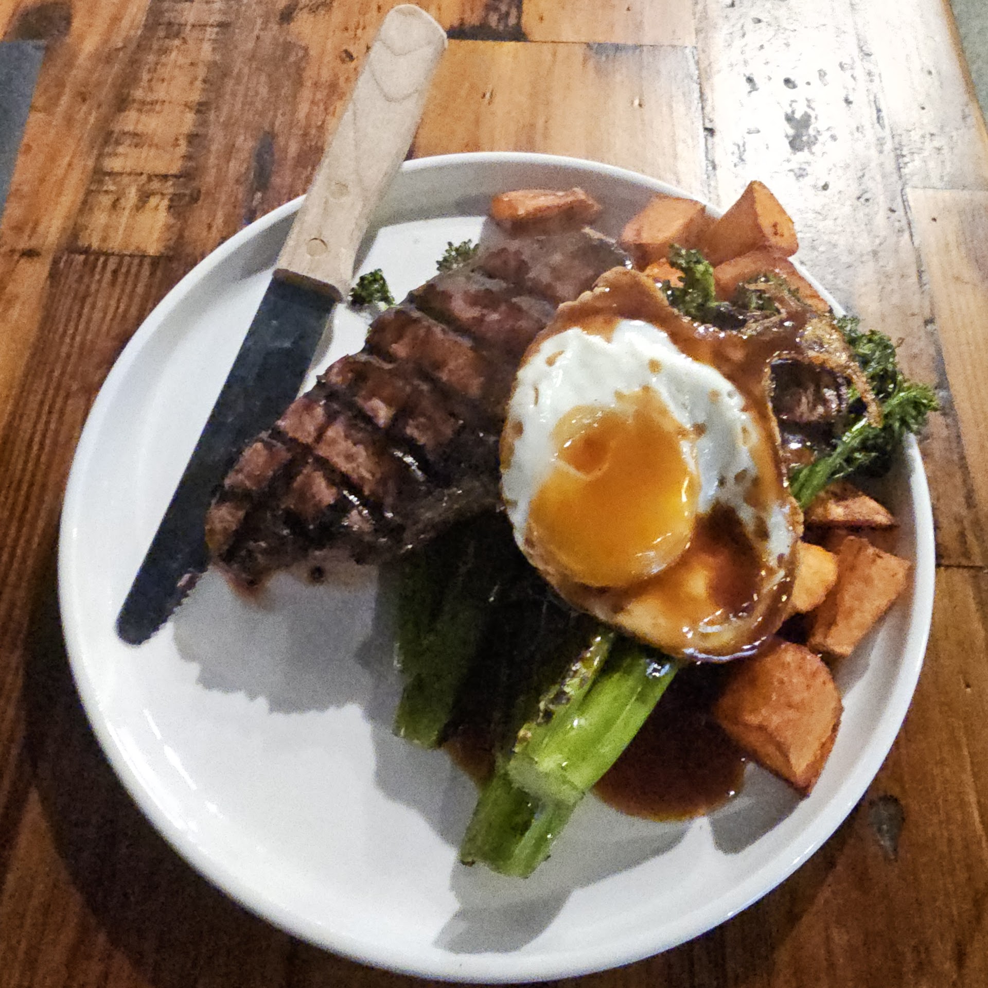 Let's talk about the Portuguese steak. The potato was probably the best on the dish. The broccolini was alright, nothing special. The egg was kind of between over medium to over hard, not sure what it supposed be.