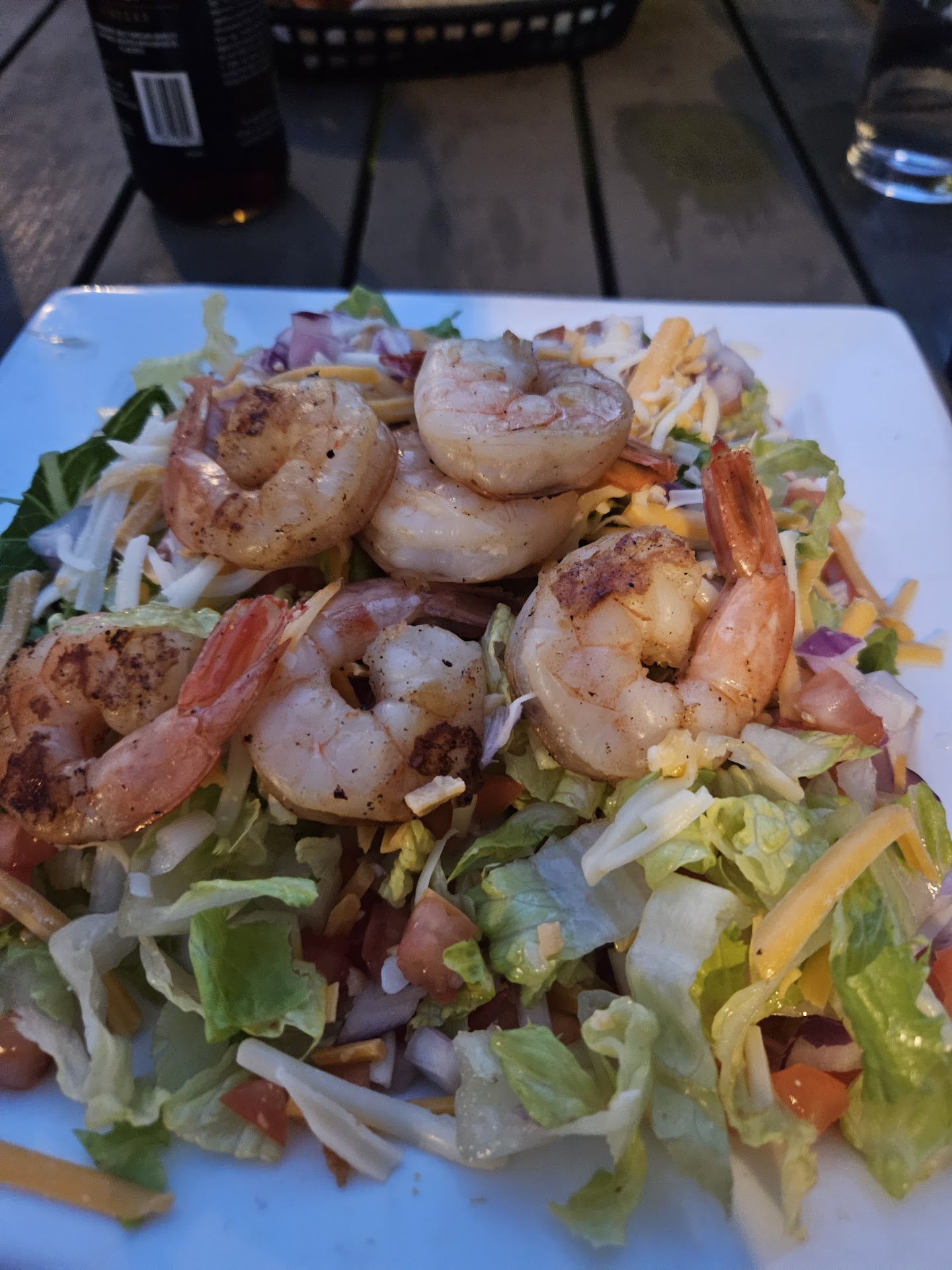 Beautiful night in New Bedford. Three of my friends and myself wandered down towards the cobblestone district. A street concert was going on. My friends and I went to Rose Alley. Rose Alley of course no longer has the roses but it also does not need to cover the pungent smell of whale oil. This New Bedford mainstay was not packed. The gang grabbed seats on the outdoor patio. We could hear the live music from a few blocks over. Our server was Chloe, who was very great! She wrote down our order. My friend had very specific requirements for his burger. Anyways I had a house salad with shrimp and 1 dozen garlic herb dry rub chicken wings. The salad was...drumroll...a salad. Lots of lettuce...very fresh, diced tomatoes were really good...again it was a salad....had six nice grilled shrimp.