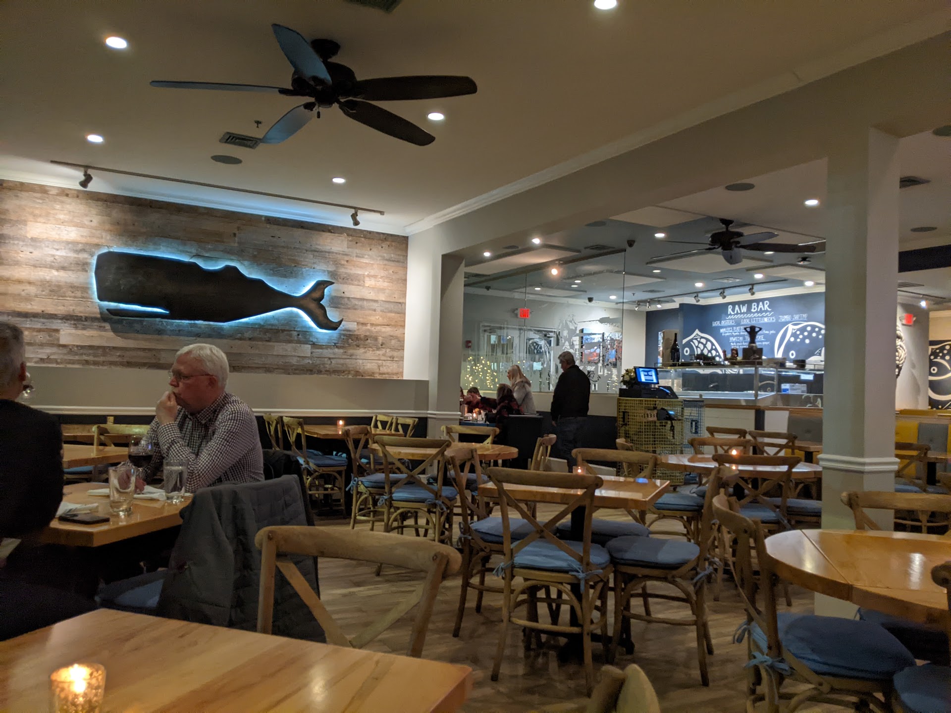 The Black Whale has sushi, has a raw bar and of course serves seafood. If one is not a seafood person, they have steak and chicken. We were a group of seven. For appetizers, we ordered BOOM BOOM SHRIMP and TRUFFLED MUSHROOM FLATBREAD, along with one other appetizer. I am not a shellfish eater but the Boom Boom Shrimp was fantastic. The Mushroom Flatbread was very good too. The drinks that I sampled were the PAINKILLER, the FALL SANGRIA that had cinnamon sugar on the rim of the glass and the CHATEAU STE. MICHELLE REISLING. I can only comment on my entrée which was GRILLED NY STEAK that had green beans and mac and cheese gratin as its sides. The steak was just as I ordered with garlic butter as opposed to blue cheese butter. The mac and cheese was very good though I would have liked a bit more cheese. I also sampled two desserts—Crème Brulée and Caramel Apple Crisp. The apple crisp was topped with a scoop of cinnamon ice cream. Never tasted or heard of cinnamon ice cream before but it was absolutely great. The apple crisp was quite good too. I love Crème Brulée and flan and the Crème Brulée did not disappoint.