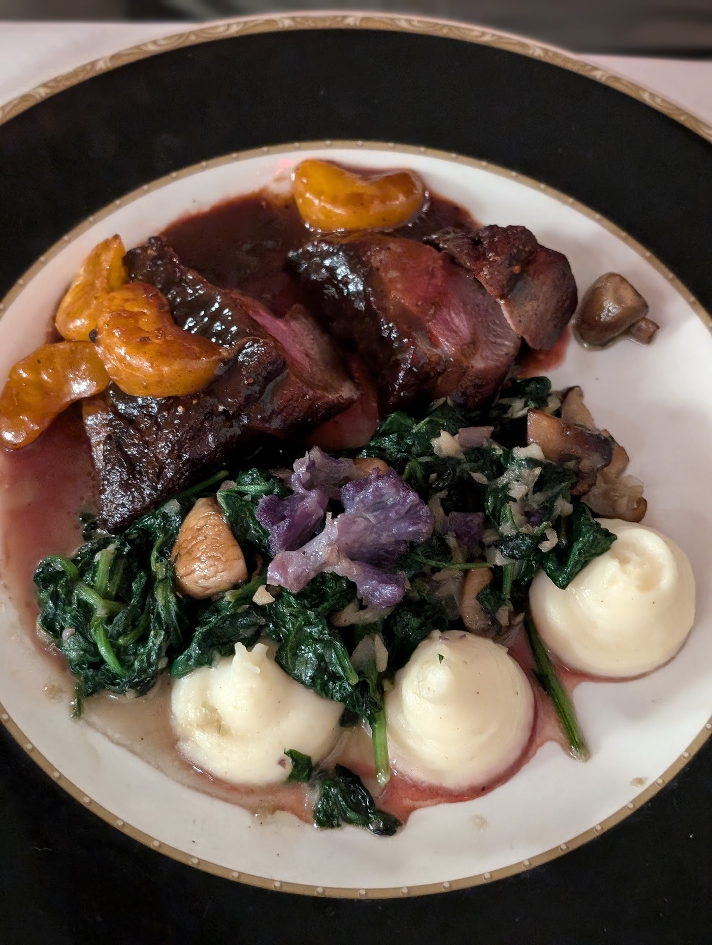 Our meals this evening. Wagyu shoulder steak grade 5 served rare with clams casino for The Jenny and rack of Lamb served rare plus for myself. 1/2 price bottles of wine on Thursday… BONUS!!! The mushroom ragout appetizer was beyond absolutely freaking delicious and amazing!!! And so was the fresh salad and Russian shchi… the Russian shchi was the best I’ve ever had short of this small remote diner in the heart of the Motherland… delicious!!! Let me not fail to mention the fresh bread and duck liver pâté… YUM!!! And as ALWAYS… not only was the food delicious and well prepared, the service was impeccably PERFECT! Thank you Kathleen and Antonino for a wonderful evening! PS… Sally is also amazing as a server!!!