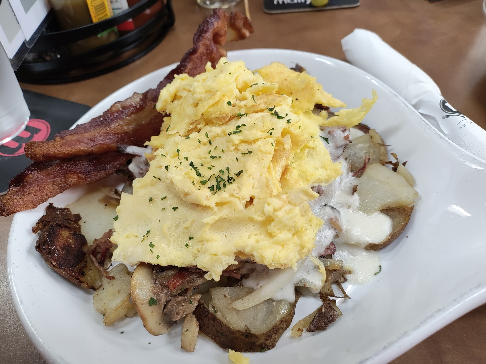 The food was okay. Nothing special, but certainly not bad. I got the Brisket Skillet. There was an overall lack of flavor. Like not even seasoned with salt and pepper before cooking the eggs or potatoes. The menu description included that it had cheese sauce on it. Nope. No cheese at all. The brisket itself was quite delicious though. After taking the leftovers home, I was able to bring it to life with some cheese and seasoning on the reheat. maybe they're just not a "brunch place." Or maybe they had an off day.