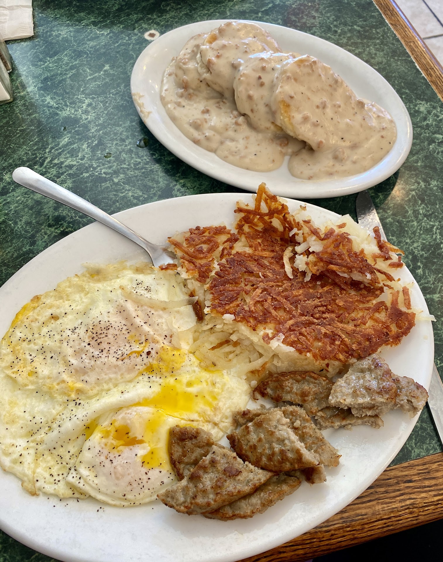 Read moreFirst time here this morning. Always would go when it was Kats cafe, will definitely be coming back! Smaller reduced menu which is a good thing, easy to make my decision. I had the biscuits & gravy which came with eggs, hash browns, toast(not pictured) which was homemade BTW, choice of sausage/bacon, husband had the Denver omelette with hash browns & toast. This is the FIRST TIME we have had to have a take home box for leftovers with a breakfast! AND ENDLESS CUPS OF COFFEE, my Dad would always say… if a restaurant has good coffee, the food...