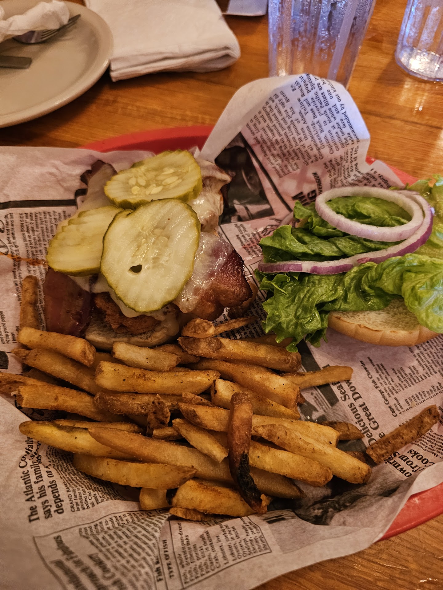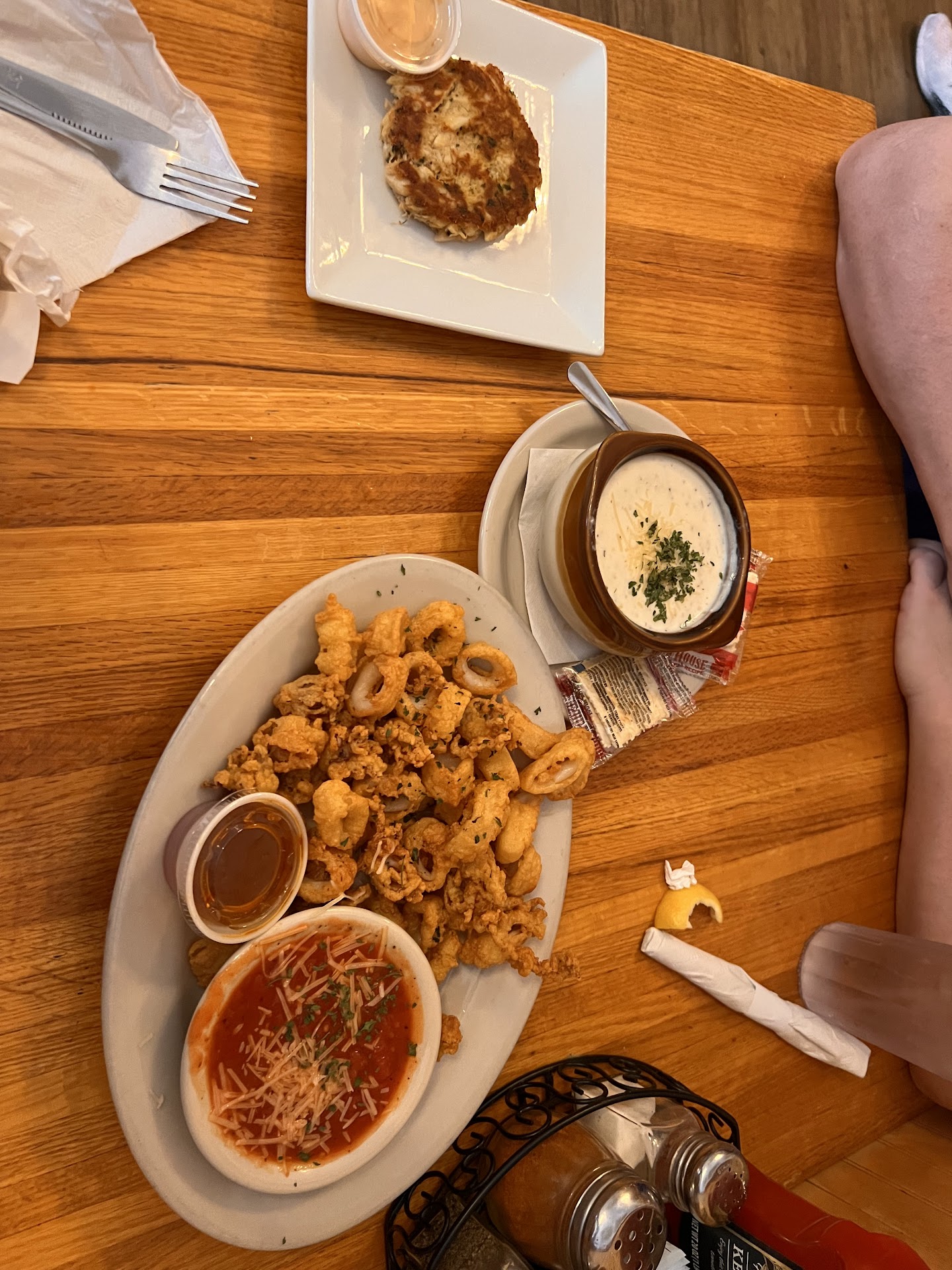 Crab cakes: ah, the famous crab cakes! Apparently the best in New Bern! They were okay; o quite enjoyed the taste and the warmth. The cake pulls a parent into stringy crabby goodness, and it isn’t bland or cooked poorly. Unfortunately… for $16, a thin small puck of crab cake is a little harder to enjoy. Can’t say I recommend this purchase. It’s just very pricy for what you get. Yummy, for sure! But very pricy. Perhaps they locally source their crab meat, and also crab is expensive in general, but it is a bit nuts to charge so much for a thin crab cake and a small sauce container.