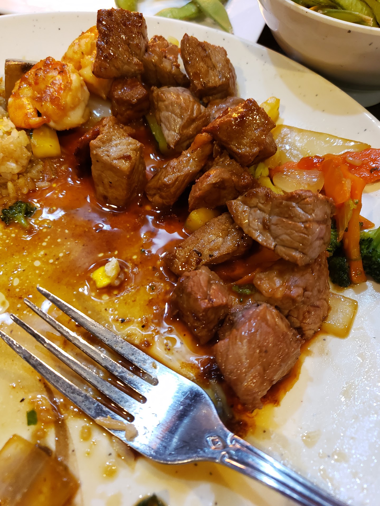 The shrimp here is very good. We got the hibachi shrimp and steak combo. However there are a few things that need to be worked on for me to come back. Keep in mind that this play just opened. I appreciate feedback for my business and so I'm going to be honest in this review. Firstly they have done a great job with the quick remodel of Golden Corral. A lot of the elements are the same but hey videos to them right. But this isn't why I'm giving it two stars. I ordered Green tea (hot). She asked if I wanted sweet and low with it and I asked for sugar instead. She comes back with it and hands me Splenda. Apparently they didn't have sugar. Okay I'll drink it with out. The tea was room temperature at best. Literally. So I asked for it to be heated a little more. Literally 5-10 mins later I get the tea back and it's about 5 degrees warmer. She asked if I wanted to heat it more and I told I would live. Now onto the food. I got the clear soup. It tasted kinda funky but I ate it any way which I think I'm regretting. Anyway the salad portions for dinner were laughable. It was very small. On to the main course. When I think of hibachi I think of food you can eat without a knife. The rice had egg in it and was whiter than the founder of the kkk. It wasn't fried rice and I don't know who lied to them. Come on dudes get it together. The vegetables were really good. The onions were a tad under cooked so you still got the raw taste in them. But the problem with them was that the sauce was so runny that it over run the plate and it was like thin strips so you couldn't really get it on the fork without using a finger. On to the steak. The steak we ordered medium and medium rare. They both were well done. It wasn't cooked like hibachi steak however. It was dry and if it weren't for the sauce from the veggies it would have just been hard to swallow. The flavor was great but not for a hibachi restaurant. The pepper they used was fresh and over powered just about everything about the steak. The shrimp was really good when it wasn't just plain burnt. The biggest disappointment here isn't the $43 for over cooked steak and cold tea, but it's the fact that the sauce has a unique sweetness to it that was really good. It's a shame to let everything else fall apart in the meal because of simple solutions. Hopefully this place finds its rhythm and delivers a better product...