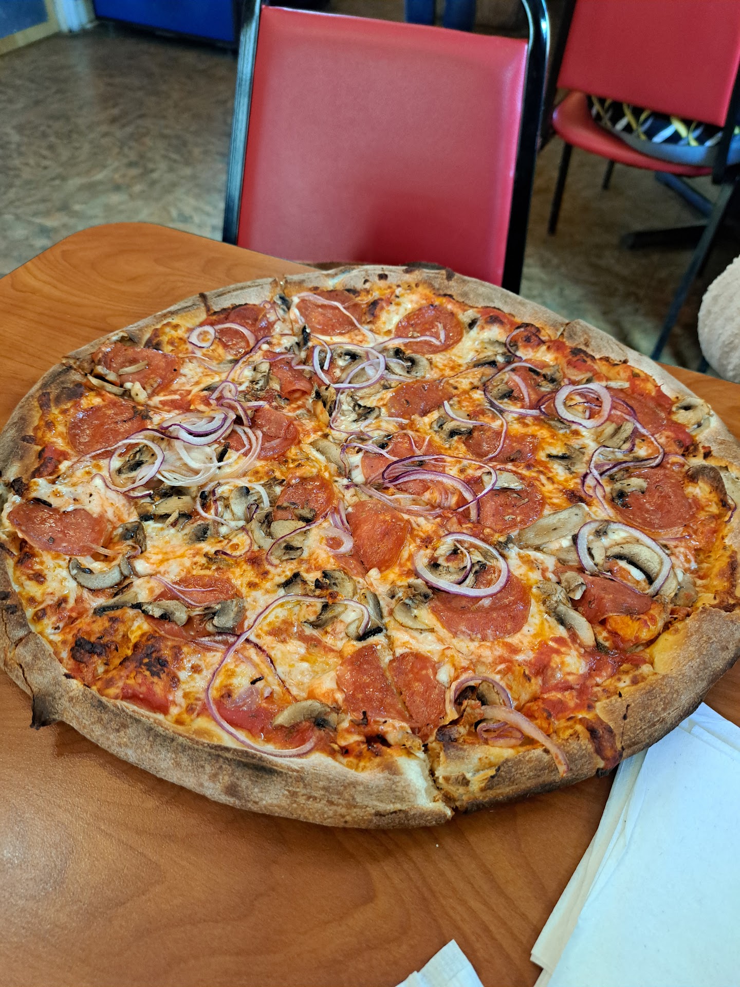 I've given this place a few opportunities to disappoint me and again tonight not even close! They told me 20 minutes for my pizza, I had to wait a little bit which was fine because I got to crack a local beer at their small bar and wait for my fresh pizza. While there enjoy the scenery of a local pizzaria/restaurant and the way it should be operating on a busy Saturday night. Management was involved, people were being sat and seemed to know one another, food smelled great and conversation was flowing. Shortly after that my pizza came out, the manager/owner like they have done in the past asked me to inspect the pizza before I left to ensure it was up to par and once again, more than up to par! They are more than generous with their toppings which always seem fresh and high quality. Also the sauce is a great mix between bitter and sweet, very well seasoned and the crust and a nice mix between crunchy and soft which can be difficult to find with a wood burning style pizza. Once again phenomenal, if your touring through New Bern or your a local and you're not getting your pizza and supporting this very professional eatery you're missing out! Being from New York and working in the pizza business most my adult life I'd have to this place has been a gem to find down here in NC. I would Highly recommend to my family...