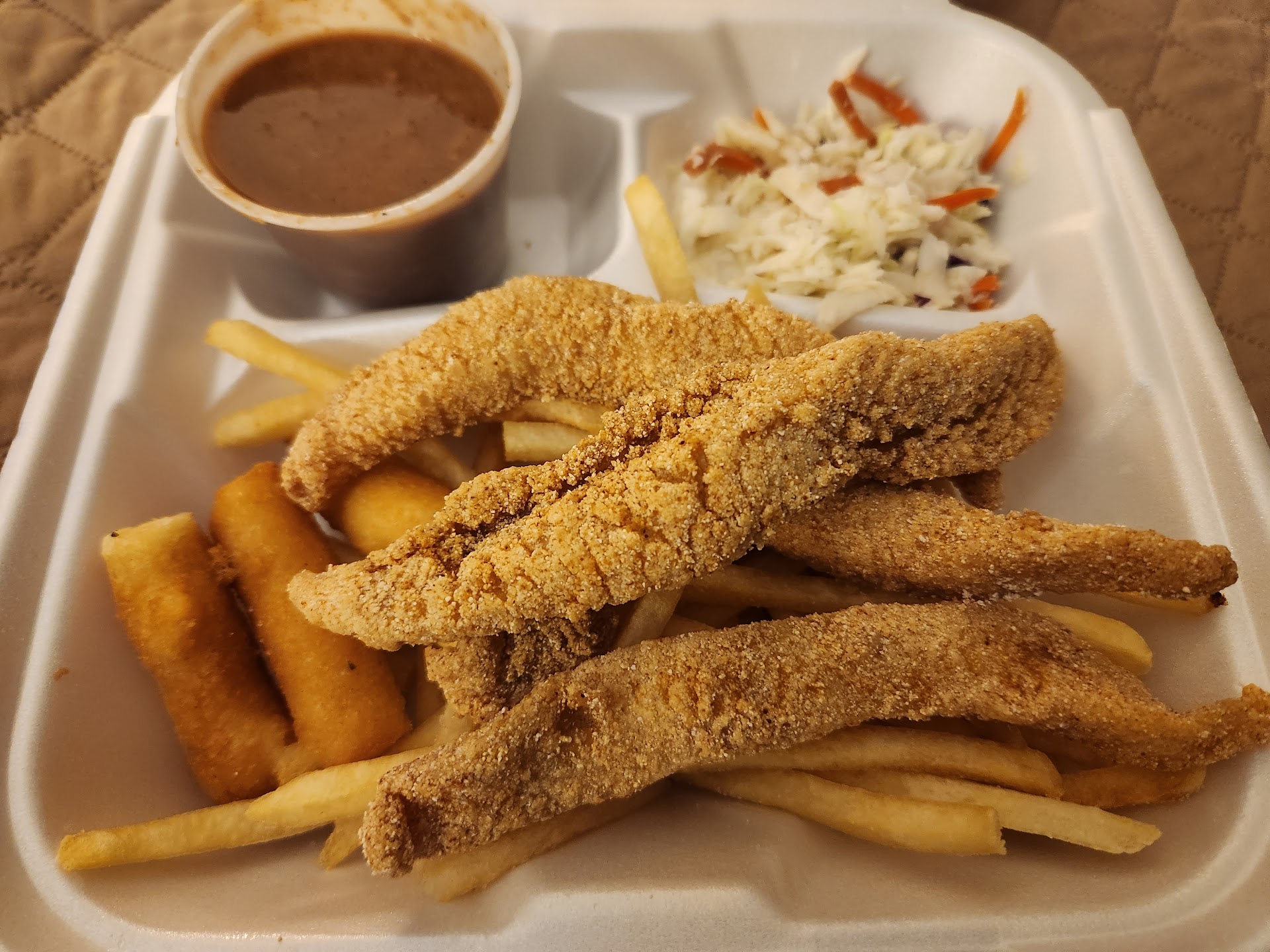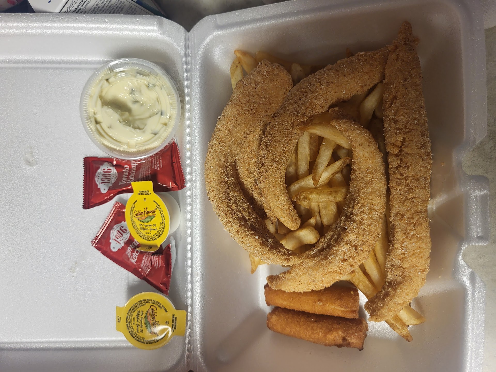 Ā Ā Ā Read moreI was craving fish for dinner so decided to give this restaurant a try. They have a drive-thru. I was behind another gentleman for about 12 minutes before I got to pull up to the window. I was at the window for another 10 minutes. I have the time logged on my phone. I had ordered a five piece meal with French fries, hush puppies, and a medium drink. This cost me $14.68. I made it home before I discovered that they had not given me my drink because it had been a long day and my mind was in about 14 different places. When I called to speak to the manager all I was told was that they were not a "fast food" restaurant. I asked what he considered a reasonable time to be for a vehicle through their drive-thru and was told 10 minutes. I asked him if he agreed with me that over 20 minutes was ridiculous and he said yes. I told him it was not worth the return trip to have cold fish with a drink. He apologized and said that all he could do was have me come by tomorrow and give me a free drink. Once I opened my box of food, you can see the five very thin strips of fish I received. Needless to say, I will...