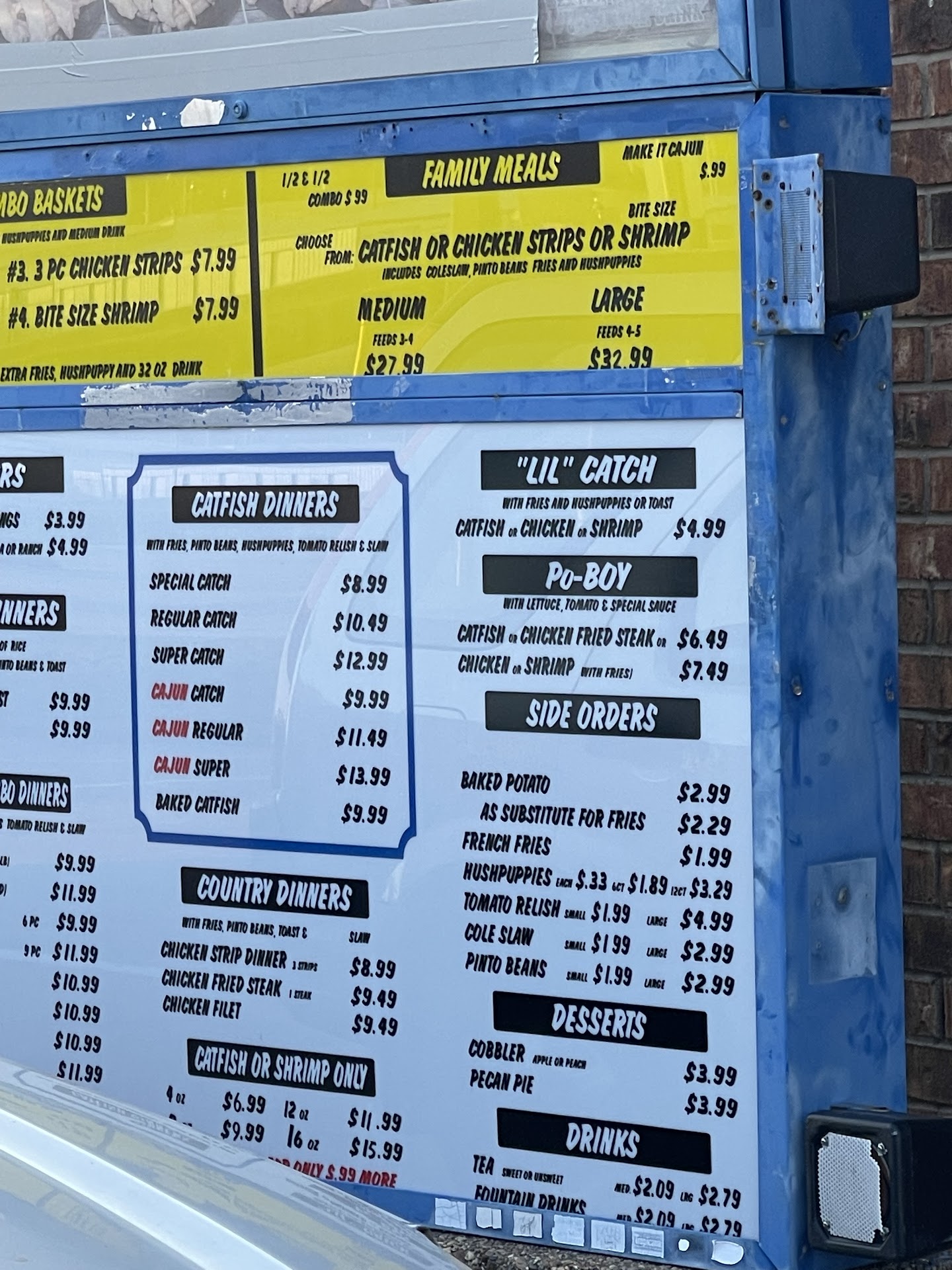 Worst catfish EVER!!! Out of 4 other choices, I decided to eat here on the way back to Dallas from a business trip with two other people. My catfish lunch came out within 5 minutes. The only thing hot was the beans. Everything else was lukewarm like it was just sitting there waiting for me to order it. The catfish pieces were TINY. I was hungry so I didn't complain...until I saw the amount of food my coworkers got when their food came out NICE AND HOT, albeit 15 minutes later. Three different plates of food, but only my catfish plate was the only one that was severely and noticeably lacking substance. When my coworker asked one of the staff why my pieces were so small, he replied that the distributor cut the pieces into smaller sizes. B.S.!!!!! They take a regular size catfish filet, then cut it in half, then cut that piece in half and serve a third of a third of fish for $7.00 and call it a 3 piece meal? I had to fill up on the beans and fries because my catfish was gone in 5 minutes. On TOP OF THAT, my stomach started hurting afterward and it was a VERY uncomfortable 2.5 hour drive back to Dallas. In my book, Catfish King is Catfish Dump. Never...