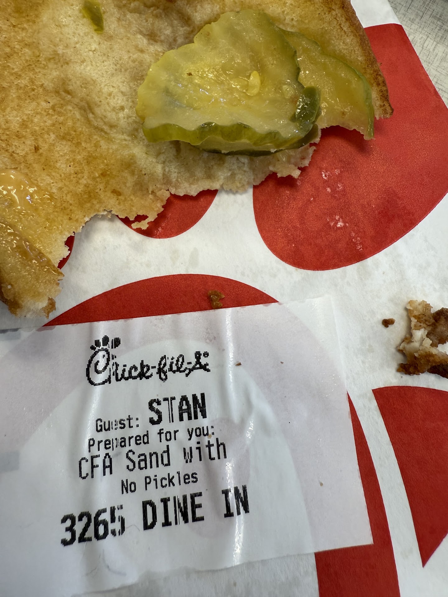 The food, even with it being lunch time was just ok (again, compared to other CFAs) it was not bad, was not cold, but also wasn't hot. Which was strange because if the time of day. 3 Stars for food.