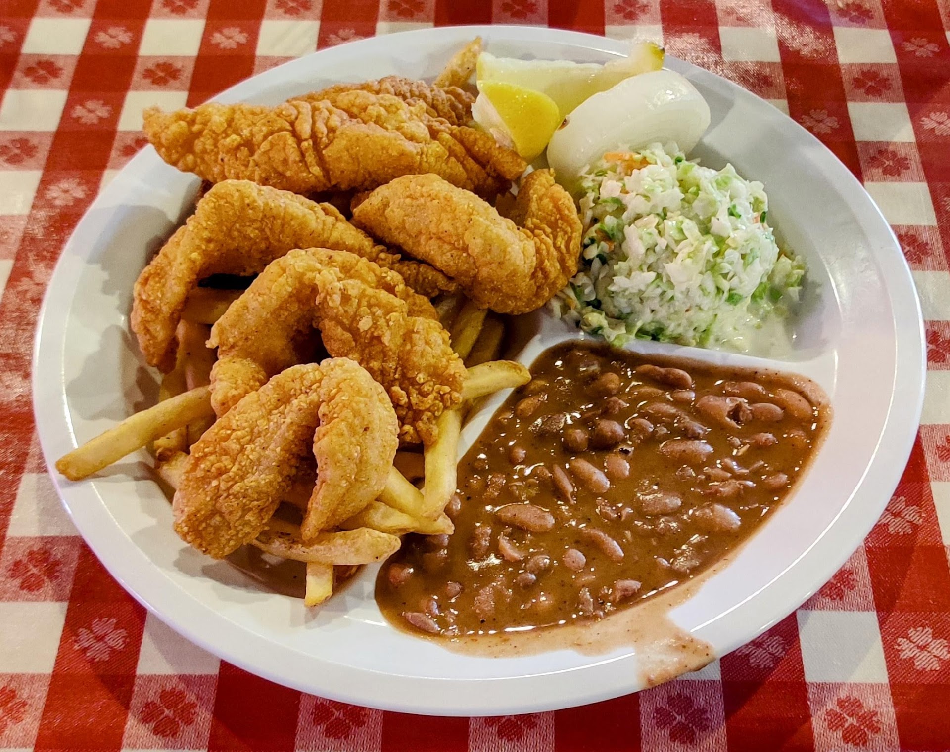 Read moreThis is how restaurants stay in business,, over 30 years running!! It is a simple formula good food,good prices,great service,and clean.what so many places cant get right this place nailed it. Let's start by saying from the moment you walk into the door the staff makes you feel welcome you're not an imposition on them you're not distracting them from their telephones they're there to serve you. The place is absolutely Charming it's a big old barn checked tablecloths picnic tables plenty of stuff to look at and admire from the past decades of antique collectability. the server immediately came up and asked us for our drink orders and if we'd like to get any appetizers started. we started with their signature onion rings very large portion enough for six people and few more to take home . I ordered a cup of the crawfish etouffee which if you're not familiar with it is a creole tomato-based almost like a gumbo but it's a little bit thicker gumbo is more of a soup etouffee is a more of a a chowder it was very good, had a nice little spice to it but like I said it is the Cajun version that has tomatoes in it not the Creole version.they have a full bar. since I was going to have their other signature dish, the catfish I just got a local beer. fried battered catfish it was a light cornmeal batter fried perfectly the fish was still very moist on the inside not a dry spot to be had and it wasn't greasy which means it was cooked at the perfect temperature it came with fries coleslaw which was extremely fresh pinto beans and some hushpuppies which had a nice little jalapeno bite to them my daughter had the chicken-fried steak my cousin had the combo platter which had fried oysters and catfish his wife had the chicken fried chicken and my wife had the fish and chips every dish I tasted was of the same quality and the gravy on the chicken fried steak was amazing right on point. the server Allison kept coming around to see if we needed a drink refills, to clear away any plates. Allison was there in a timely fashion to see if we would like or had room for any kind of dessert which we did get one slice of there buttermilk Pie which was absolutely delicious a very custardy buttermilk type pie. bring your appetite or get ready to carry home a bunch of...